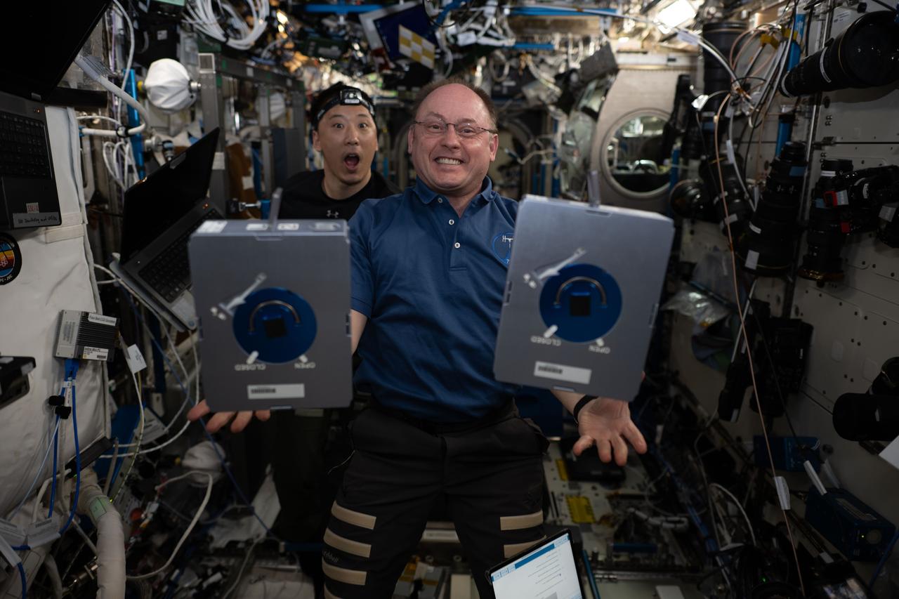 iss073e0886423 (Oct. 17, 2025) --- NASA astronauts (from left) Jonny Kim and Mike Fincke, both Expedition 73 flight engineers, pose for a fun portrait during research and maintenance activities inside the International Space Station's Destiny laboratory module. Fincke shows off a pair of research cassettes housing samples for the Pharmaceutical In-space Laboratory experiment that explores growing protein crystals in microgravity. Results may promote the development of new pharmaceuticals and advanced therapies in weightlessness.