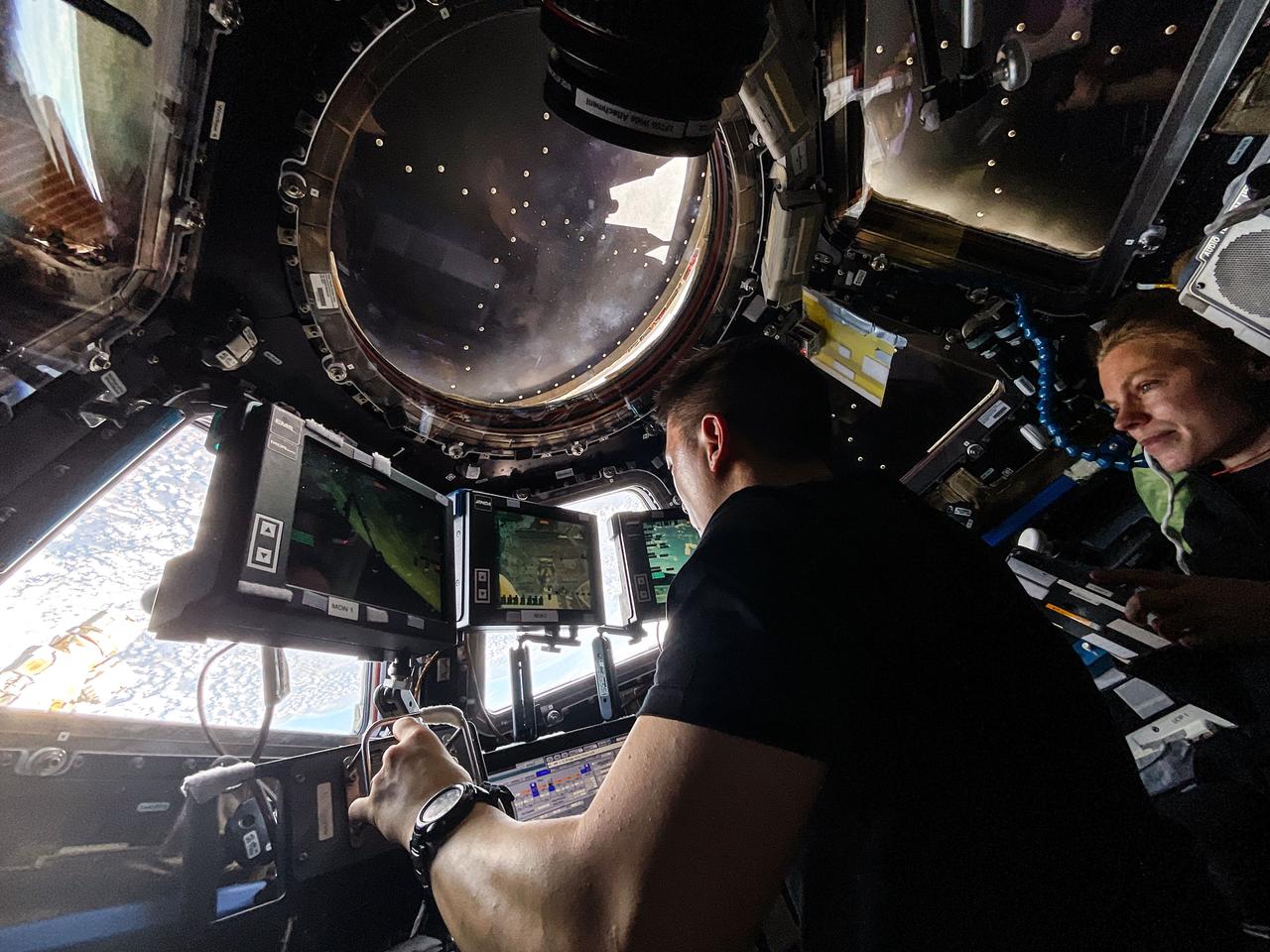 iss073e0981653 (Sept. 11, 2025) --- Expedition 73 Flight Engineers Jonny Kim and Zena Cardman, both NASA astronauts, practice Canadarm2 robotic maneuvers at the robotics workstation inside the International Space Station's cupola. The duo was preparing for the robotic capture of the Northrop Grumman Cygnus XL cargo spacecraft that launched on Sept. 14, 2025, and arrived on Sept. 18 delivering about 11,000 pounds of science, supplies, and hardware to the Expedition 73 crew.