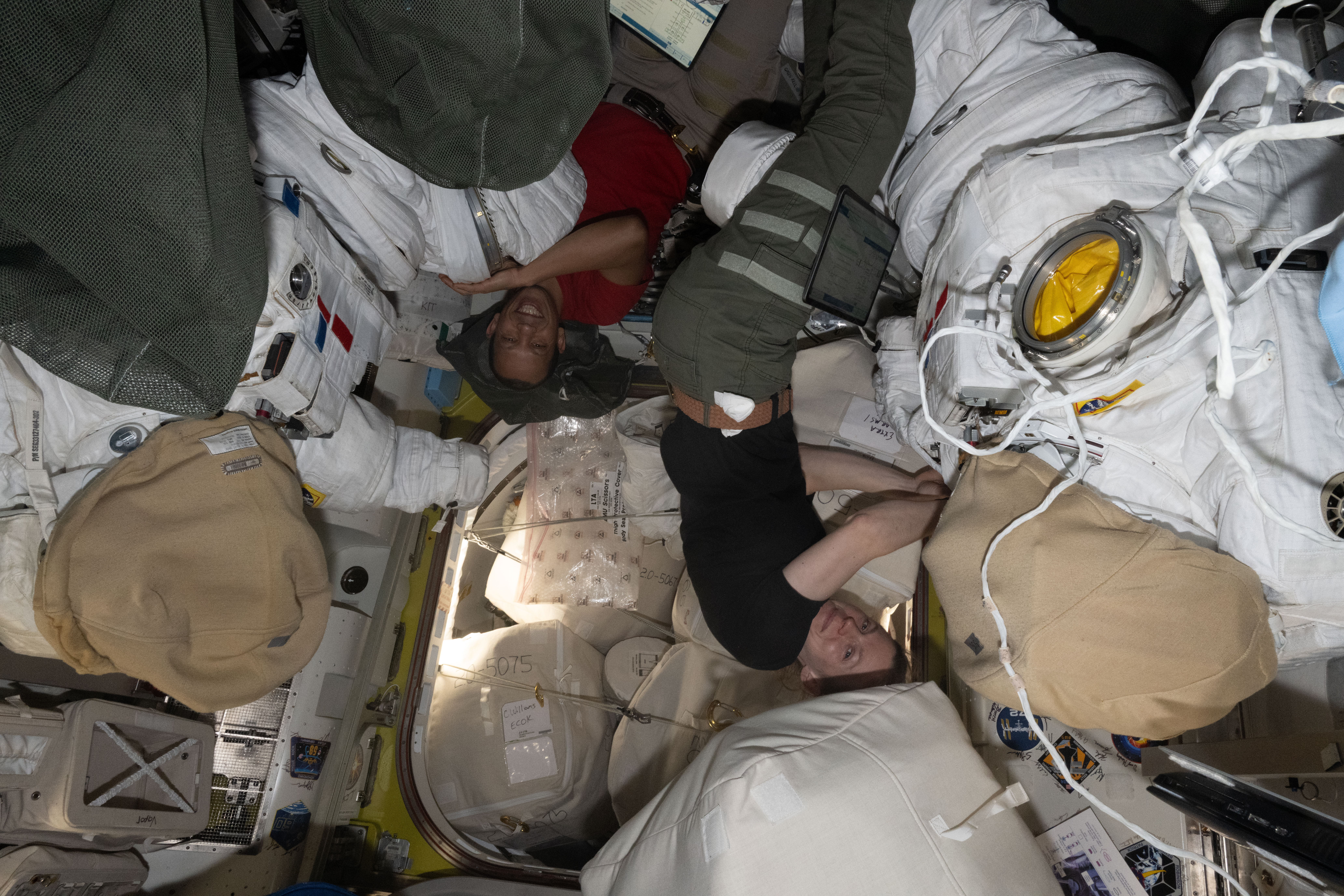 iss074e0000616 (Dec. 16, 2025) --- NASA astronauts Chris Williams and Zena Cardman, both Expedition 74 Flight Engineers, work on spacesuit maintenance inside the International Space Station's Quest airlock.