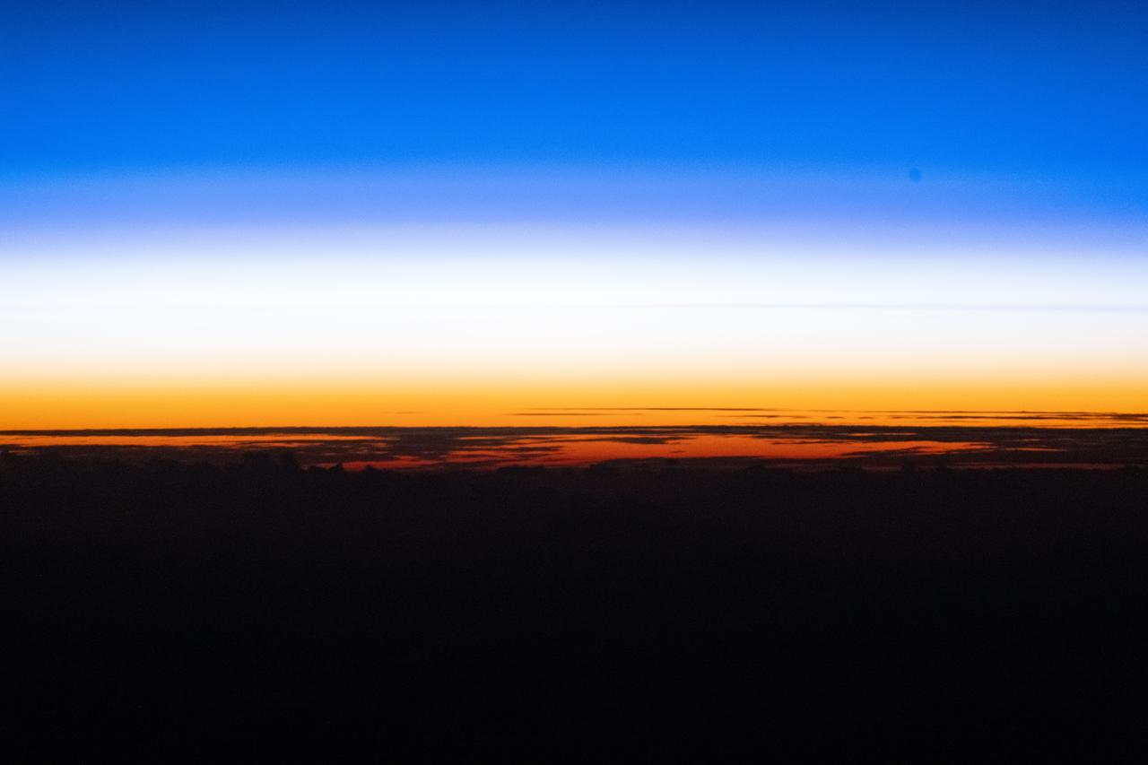 iss074e0046371 (Jan. 3, 2025) --- An orbital sunset silhouettes the cloud tops above the Pacific Ocean as the atmosphere along the horizon fades from orange to white, then to blue, in this photograph taken from the International Space Station while it orbited 262 miles above Earth. Credit: NASA/Chris Williams