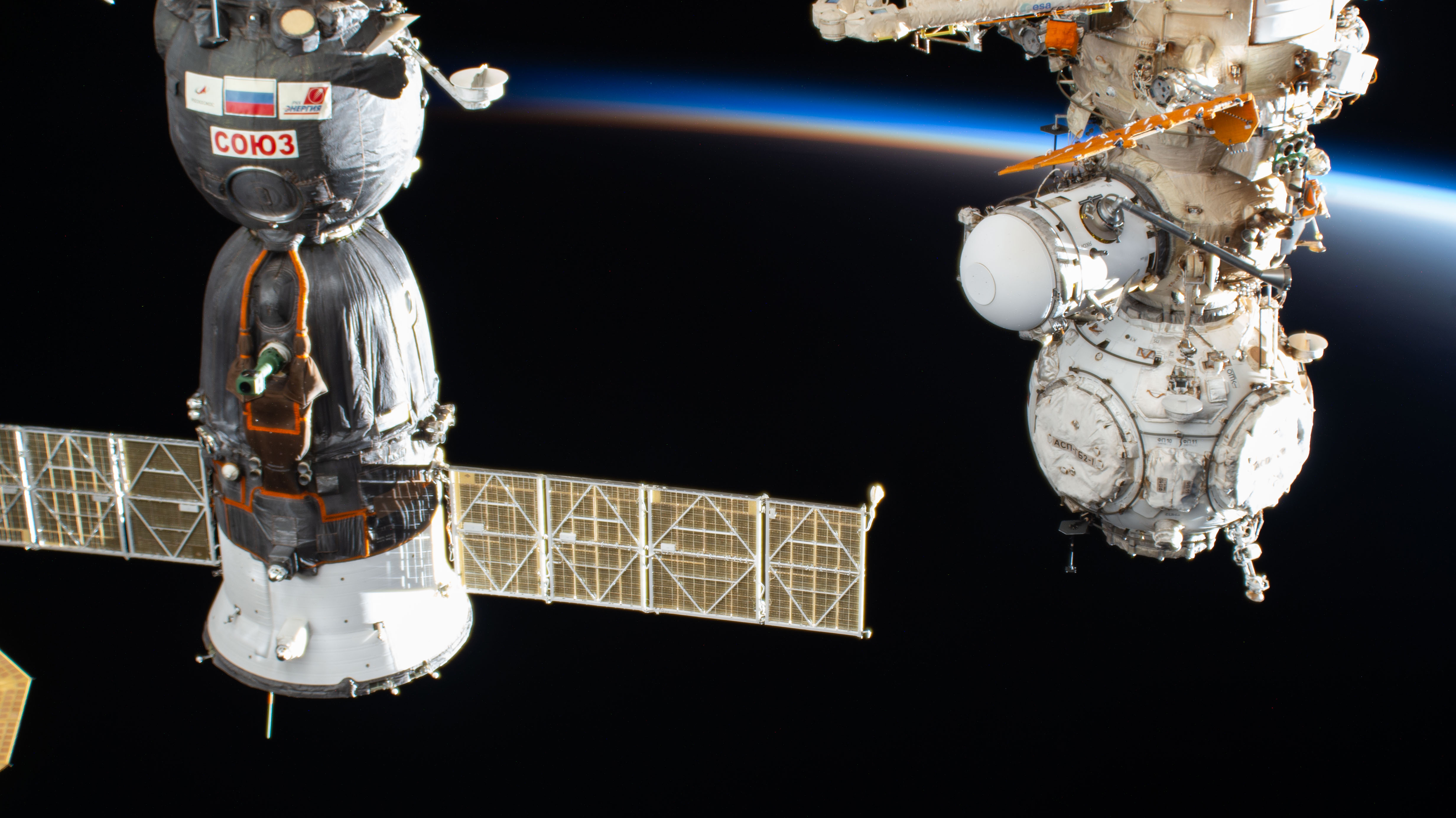 iss074e0089785 (Jan. 25, 2026) --- The International Space Station orbits into a sunset 260 miles above China near the Yellow Sea. In the foreground, are the Soyuz MS-28 crew spacecraft (left) and the Prichal docking module (right) attached to the Nauka science module.