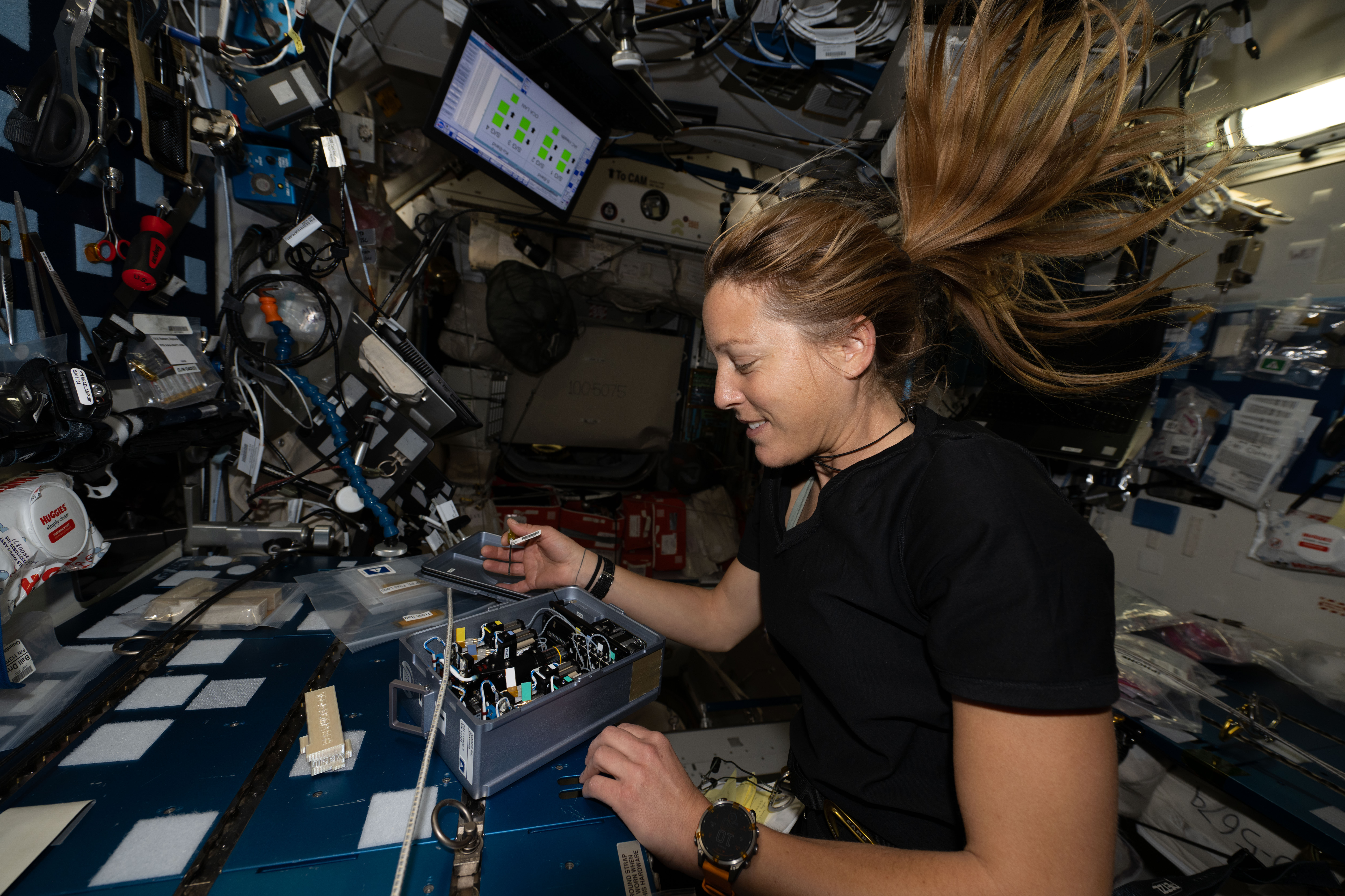 iss074e0316030 (Feb. 18, 2026) --- ESA (European Space Agency) astronaut and Expedition 74 flight engineer Sophie Adenot installs research components inside the Advanced Space Experiment Processor‑2 (ADSEP‑2), which houses and processes samples for a variety of biology and physics experiments aboard the International Space Station. The ADSEP‑2 can also operate inside SpaceX Dragon and Northrop Grumman spacecraft during launch and throughout their stays at the orbital outpost. Credit: NASA/Jessica Meir