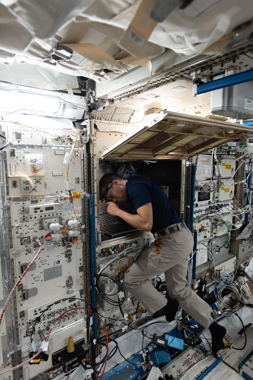 iss074e0326337 (Feb. 25, 2026) --- NASA astronaut and Expedition 74 flight engineer Chris Williams works inside the International Space Station's Kibo laboratory module. Williams opened up Kibo's multi-purpose small payload rack to install and configure advanced robotics hardware for the TUSK (Test facility for lab-aUtomation System in Kibo) technology demonstration. TUSK is demonstrating precision mobility and experiment automation in microgravity using a pair of small robotic arms to reduce crew workloads. Credit: NASA/Chris Williams