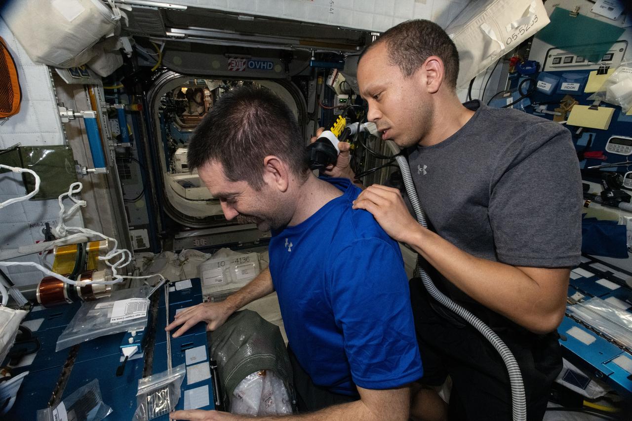 iss074e0335622 (March 1, 2026) --- Weekends on the International Space Station are for housecleaning and haircuts. NASA astronaut Chris Williams trims the hair of fellow NASA astronaut Jack Hathaway, both Expedition 74 flight engineers, using an electric razor attached to a vacuum that collects loose clippings to keep the station’s atmosphere clean in microgravity. Credit: NASA/Chris Williams