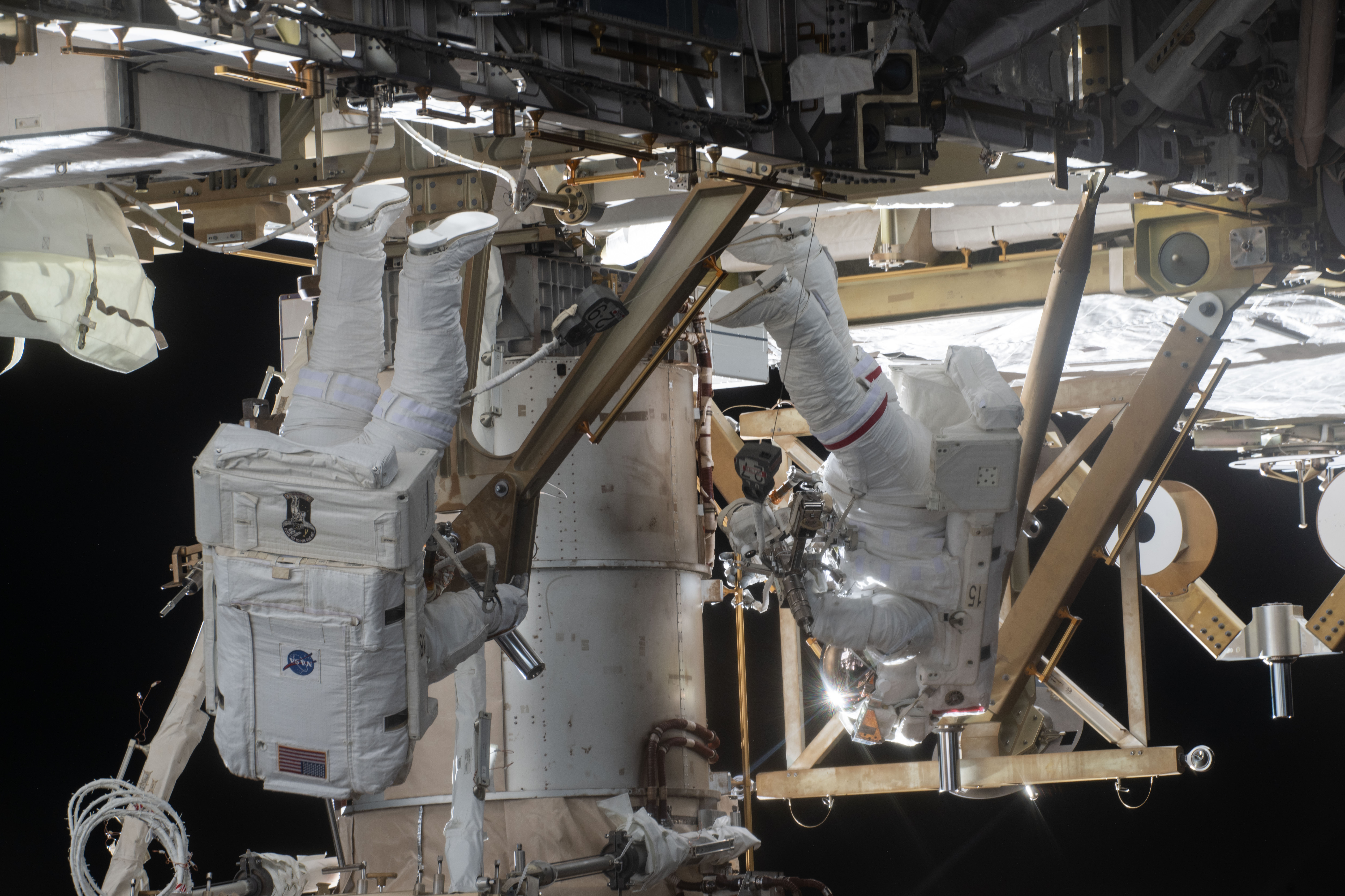 iss074e0404896 (March 18, 2026) -- NASA astronauts Chris Williams (left) and Jessica Meir (right) are pictured installing a roll-out solar array modification kit to the International Space Station during a seven-hour, two-minute spacewalk on March 18, 2026. Credit: NASA