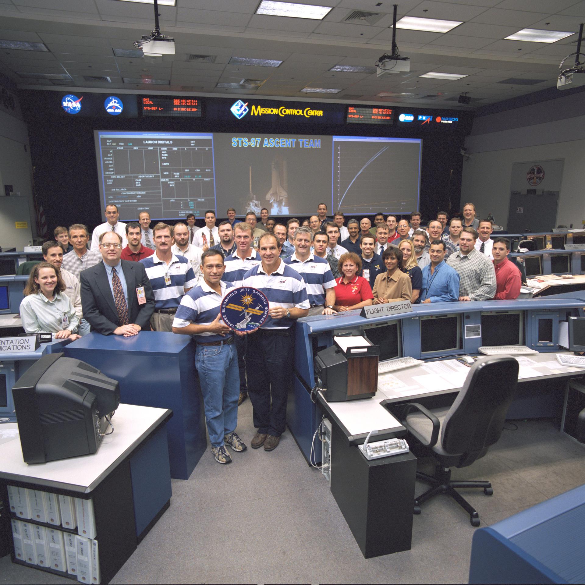 JSC2000-07294 (20 November 2000) --- The 40-odd flight controllers assigned to the STS-97 ascent team and some special guests pose for a group portrait in the shuttle flight control room in Houston's Mission Control Center (JSC). The five guests attired in the blue and white shirts are the flight crew members for the STS-97 crew, scheduled to be launched from Florida on the last day of this month. The astronauts are, from the left, Joseph R. Tanner, Carlos I. Noriega, Brent W. Jett, Jr., Michael J. Bloomfield and Marc Garneau, who represents the Canadian Space Agency (CSA). Ascent shift flight director Wayne Hale stands next to Tanner.