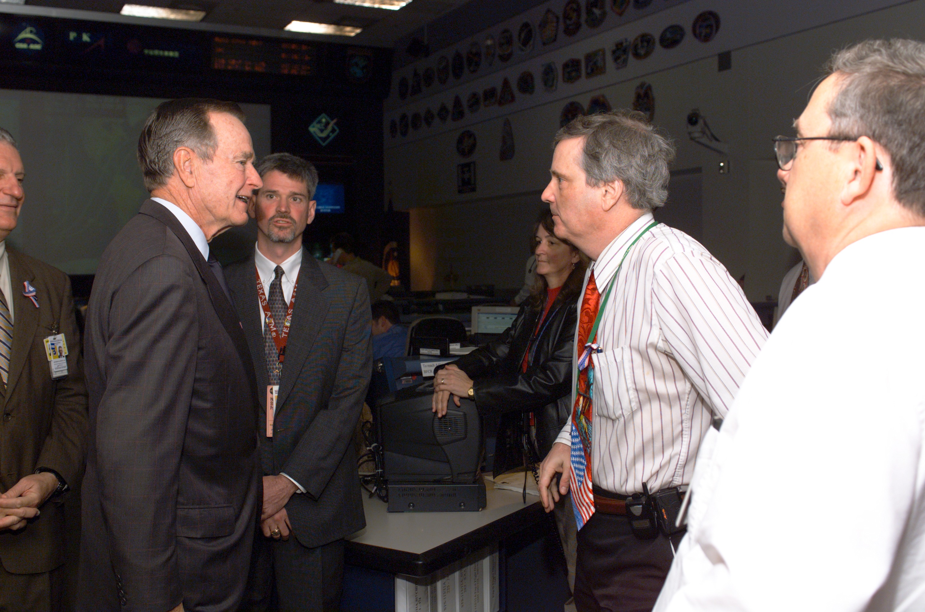 JSC2003-E-05215 (3 February 2003) --- Former President George H.W. Bush (second left) asks a question of Robert Castle during a visit to the Johnson Space Center's Mission Control Center. Others pictured include JSC Director Gen. Jefferson D. Howell, Jr. (far left) and Flight Director Bryan Lunney.