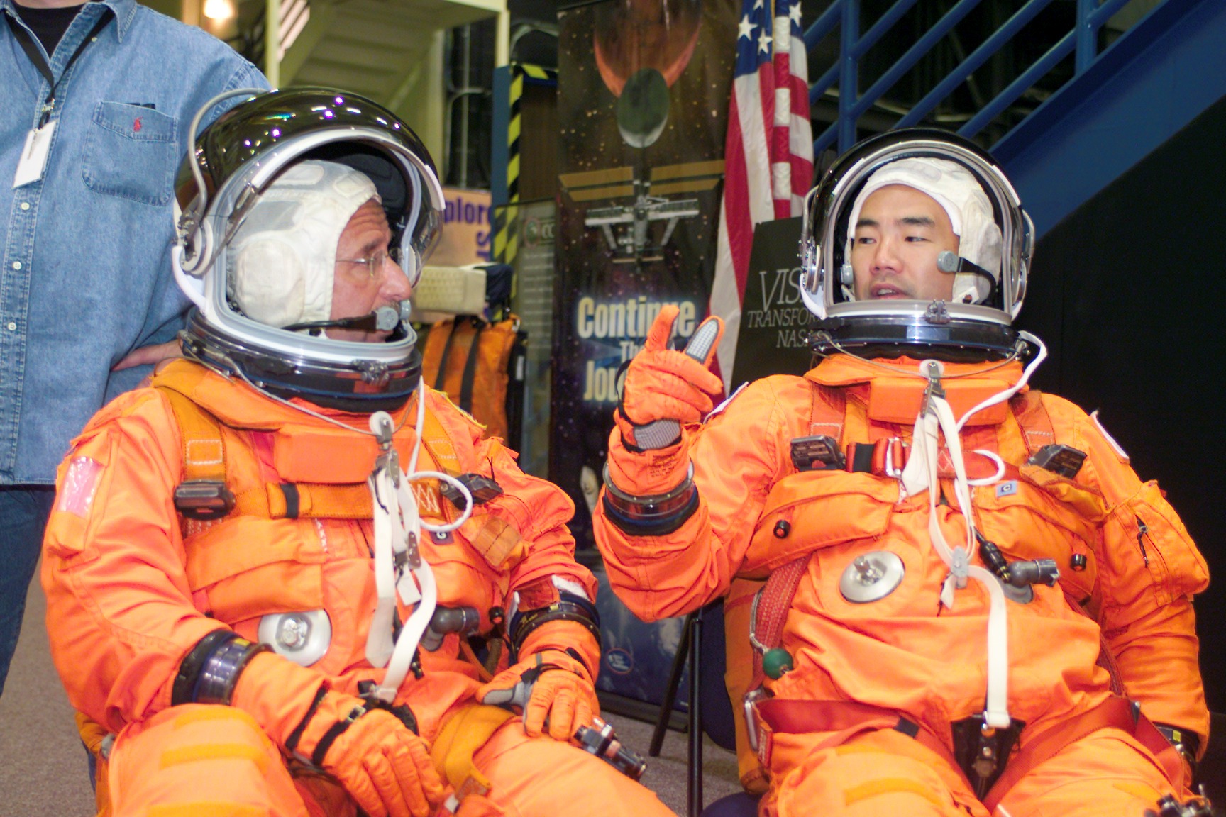 JSC2004-E-42291 (24 September 2004) --- Astronaut Charles J. Camarda (left) and JAXA astronaut Soichi Noguchi, both STS-114 mission specialists, attired in training versions of the shuttle launch and entry suit, await the start of a mission training session in the Space Vehicle Mockup Facility at Johnson Space Center (JSC).