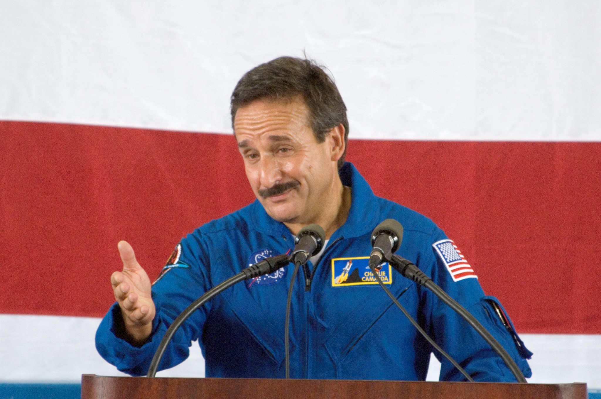 JSC2005-E-33431 (10 August 2005) --- Astronaut Charles J. Camarda, STS-114 mission specialist, addresses a crowd on hand at Ellington Field’s Hangar 276 near Johnson Space Center (JSC) during the STS-114 crew return ceremonies.