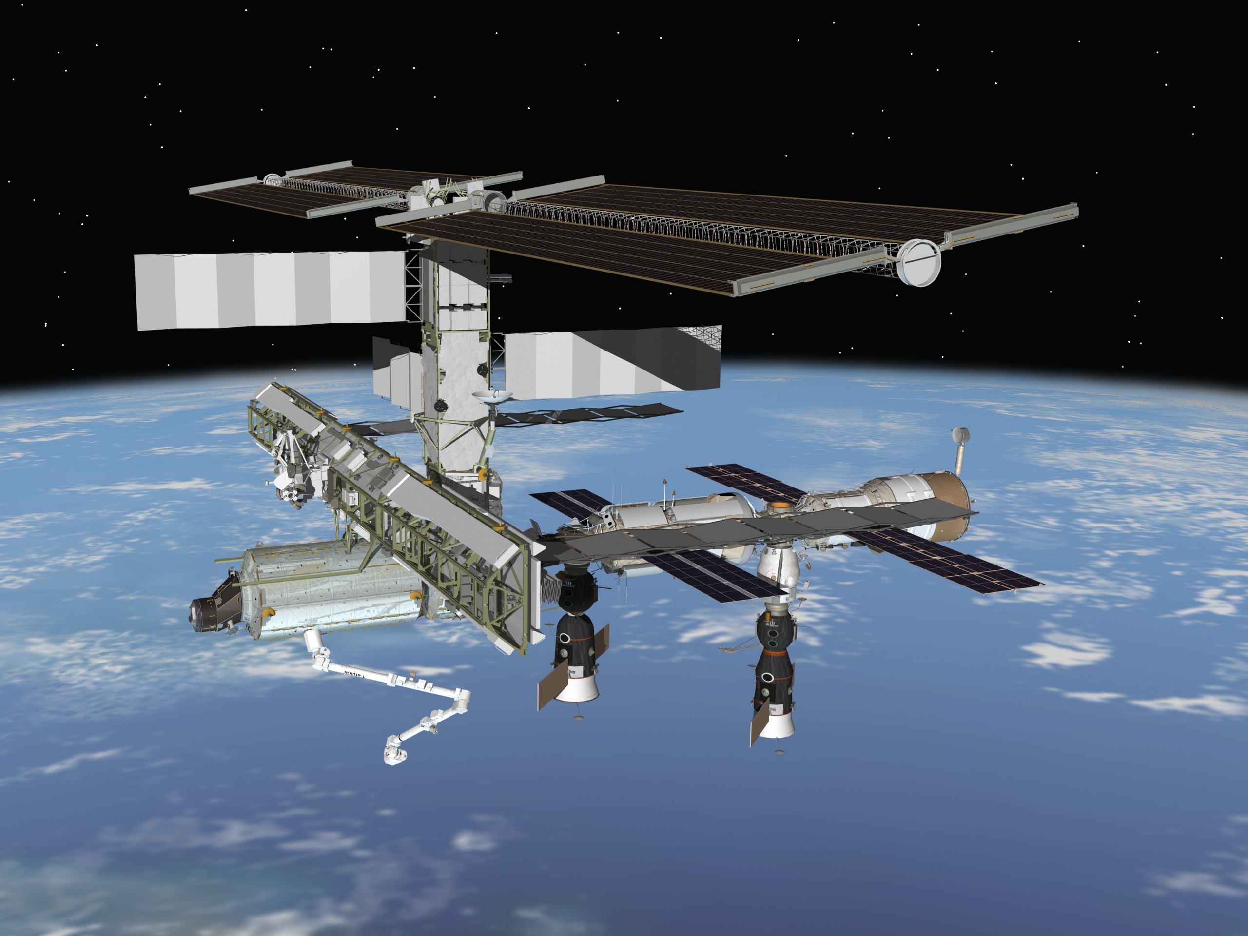 JSC2006-E-06376 (April 2006) --- Computer-generated artist’s rendering of the International Space Station following scheduled activities of April 8, 2006. This angle shows the port side view of the orbiting complex. Soyuz 11 undocks from the Zvezda Service Module aft port, returning the Expedition 12 crew to Earth. Soyuz 12 is docked to the Zarya Module nadir port and Progress 20 resupply vehicle remains docked to the Pirs Docking Compartment.