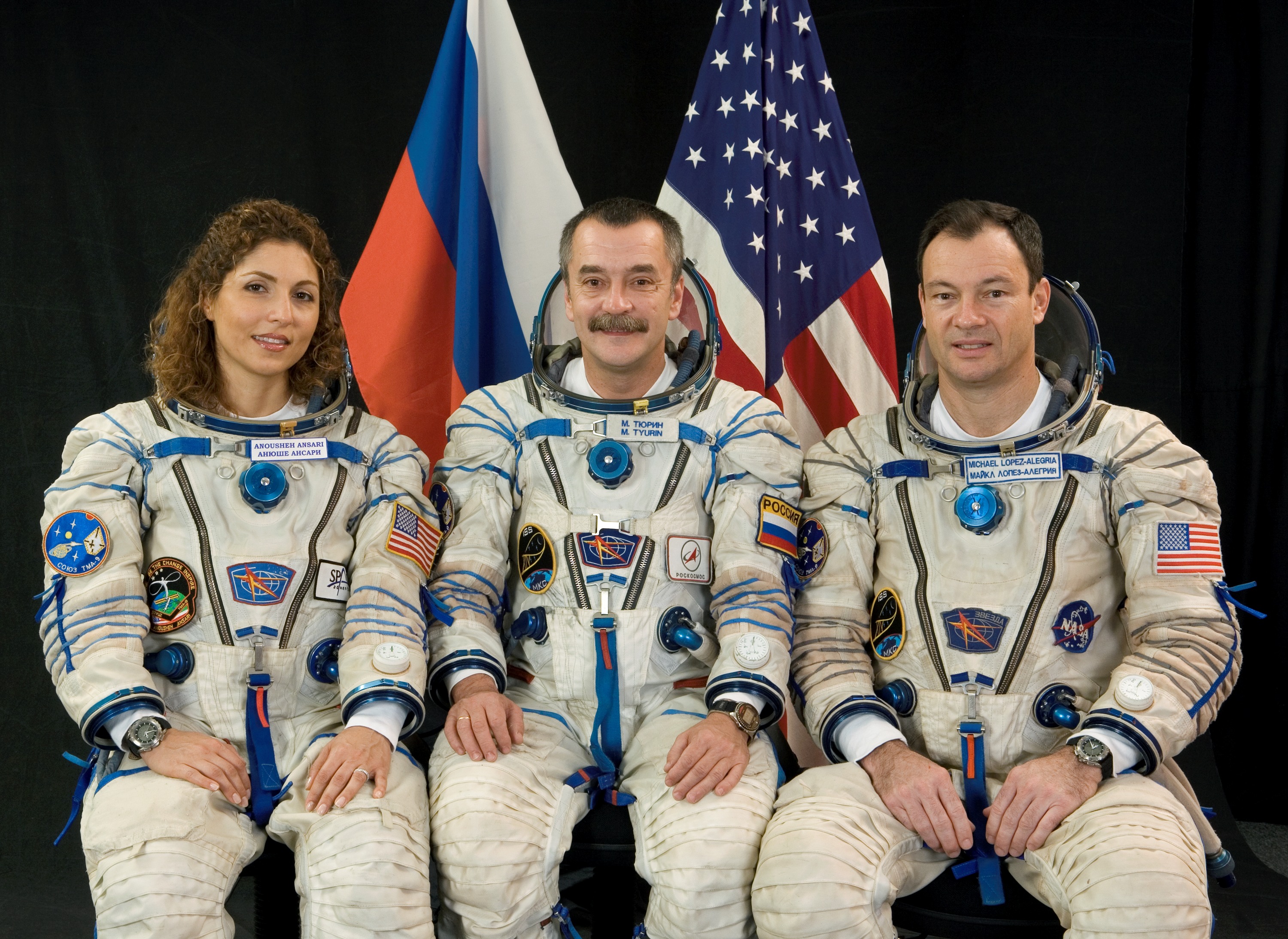 JSC2006-E-38890 (8 Nov. 2005) --- Attired in Russian Sokol launch and entry suits, astronaut Michael E. Lopez-Alegria (right), Expedition 14 commander and NASA space station science officer; cosmonaut Mikhail Tyurin, flight engineer representing Russia's Federal Space Agency; and spaceflight participant Anousheh Ansari take a break from training in Star City, Russia to pose for a portrait. Photo credit: Roscosmos / Gagarin Cosmonaut Training Center