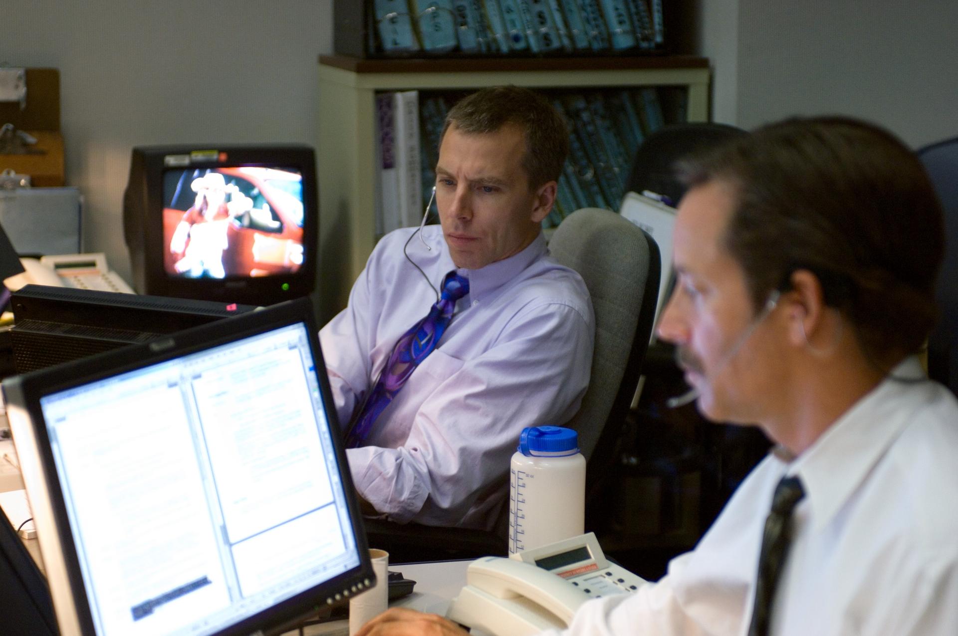 JSC2006-E-38929 (31 Aug. 2006) --- Astronaut Andrew J. Feustel (background), spacecraft communicator (CAPCOM), and flight director Rick LaBrode monitor data at their consoles in the Station (Blue) Flight Control Room in Houston's Mission Control Center during Expedition 13 mission activities.