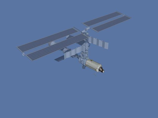 JSC2006-E-43485 (February 2001) --- Computer-generated artist's rendering of the International Space Station after flight STS-98/5A. The STS-98 crew installed the new Destiny laboratory module after removing it from Space Shuttle Atlantis payload bay. Pressurized Mating Adapter-2 (PMA-2) is relocated to the front of Destiny.