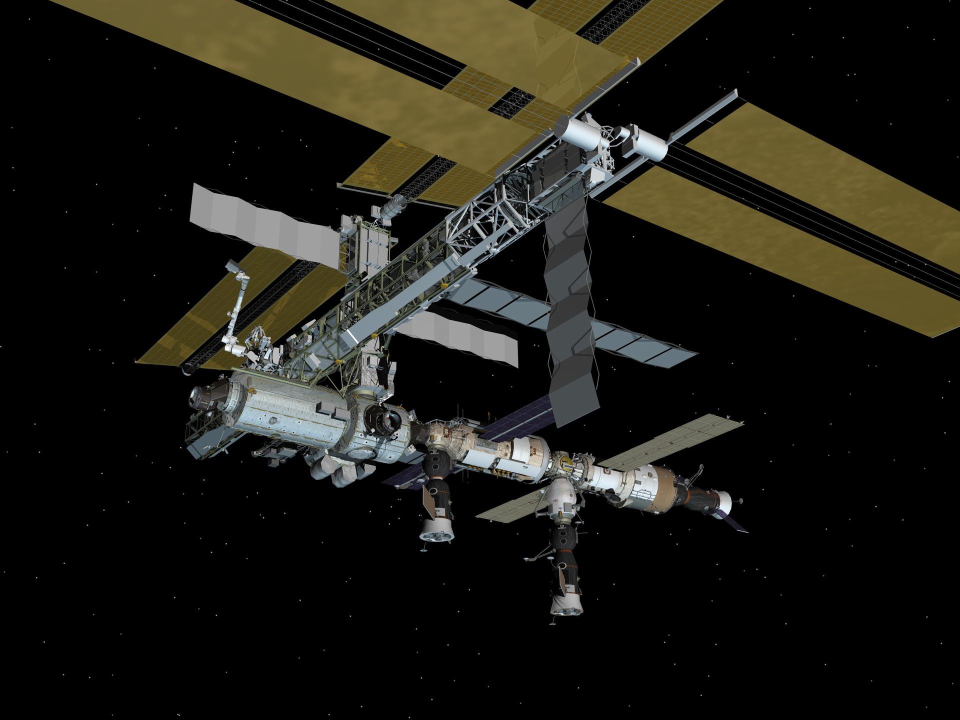 JSC2006-E-45448 (October 2006) --- Computer-generated artist's rendering of the International Space Station following scheduled activities of Oct. 26, 2006. This angle shows the port side of the orbiting complex. Progress 23 resupply vehicle docks to the Zvezda Service Module aft port. Soyuz 13 (TMA-9) is connected to Zarya Module nadir port and Progress 22 resupply vehicle remains linked to the Pirs Docking Compartment.