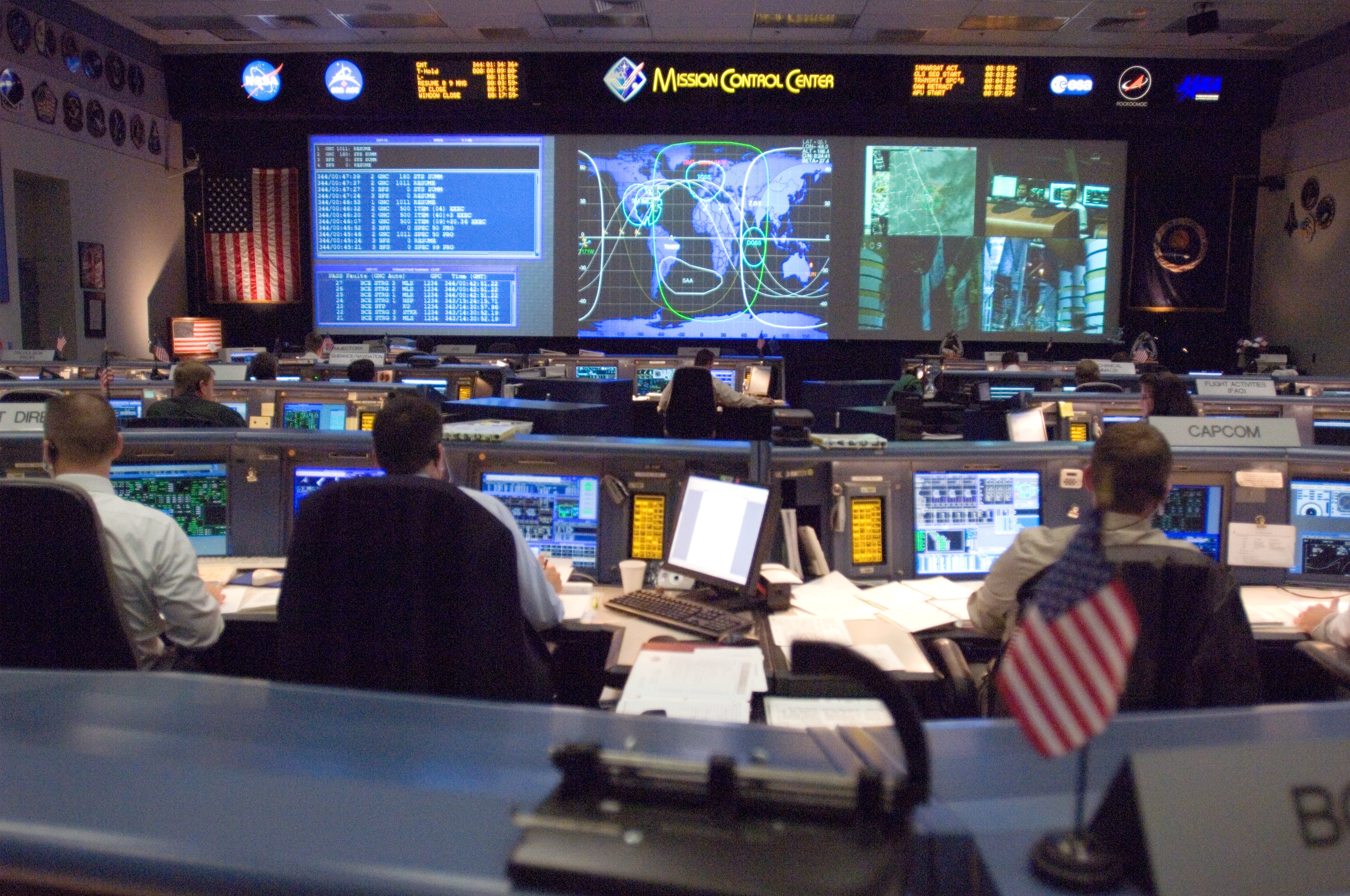 JSC2006-E-53518 (9 Dec. 2006) --- Overall view in the shuttle flight control room, from the point of view of the Booster console, on launch day for STS-116. Steve Stich (center) and Norm Knight (far left), ascent and entry flight directors, respectively, are seated at their consoles.