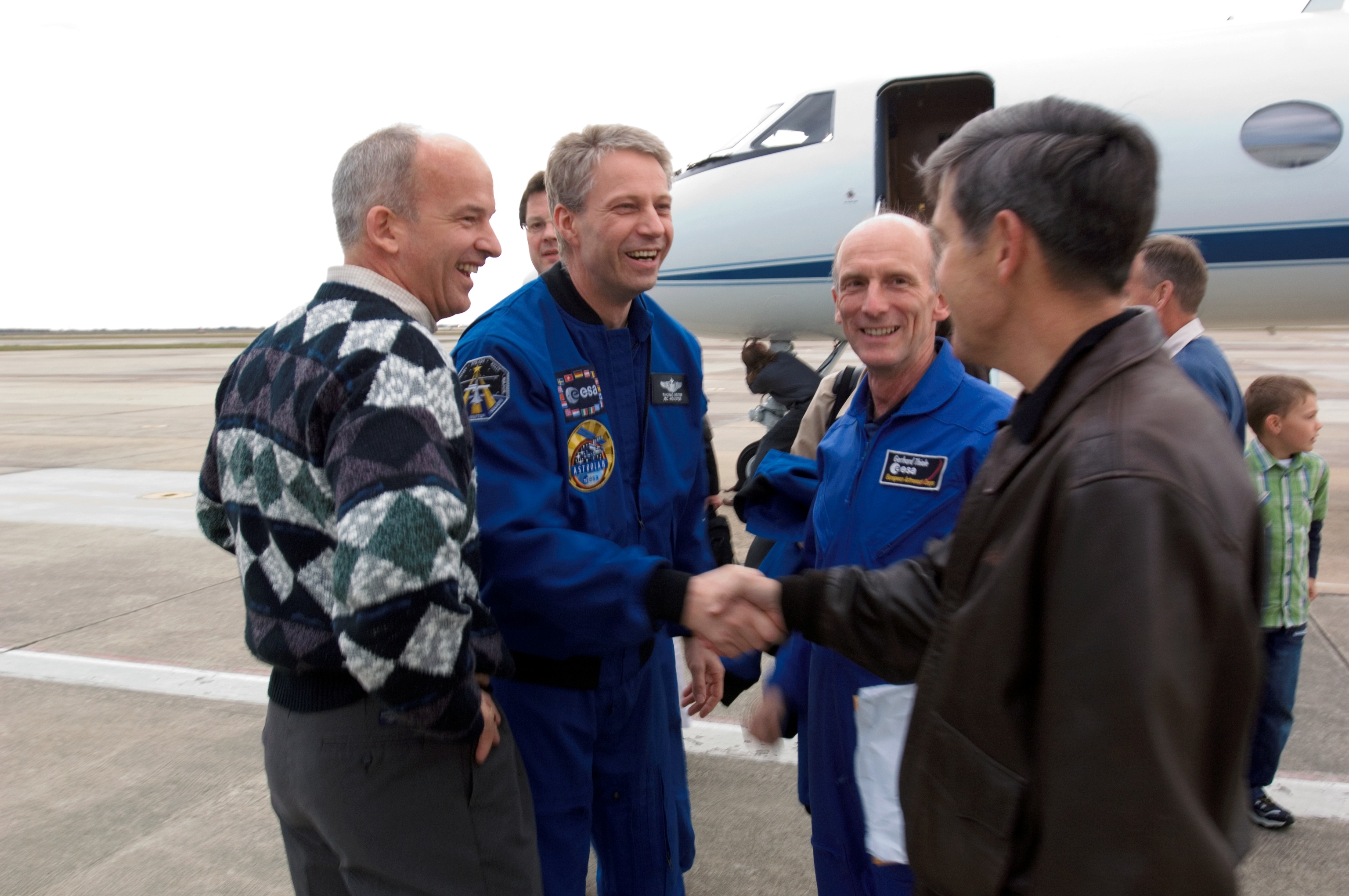 JSC2006-E-54836 (23 Dec. 2006) --- In this scene at Ellington Field, European Space Agency astronaut Thomas Reiter (second left, foreground) shakes hands with JSC deputy director Robert D. Cabana. Reiter had just arrived from Florida, along with the STS-116 crew. He completed half a year aboard the International Space Station before departing the station with the STS-116 astronauts, who landed at the Kennedy Space Center on Dec. 22. Part of Reiter's time onboard the orbital outpost was spent with astronaut Jeffrey N. Williams, left, Expedition 13 flight engineer and NASA station science officer. ESA astronaut Gerhard Thiele is also pictured.