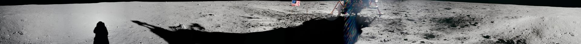 Panoramas of Apollo sites are required to familiarize various Constellation projects with the actual nature of the lunar surface. This image is the first of a multi-framed panorama photographed from a point some 30 or 40 feet west of the plus-Z (west) footpad of the Lunar Module "Eagle." The view is looking toward the southwest showing part of the horizon crater rim that was pointed out as being visible from the Eagle's window. Image taken at Tranquility Base. View was created using Apollo 11 images - mag 40 frames 5881 thru 5891.