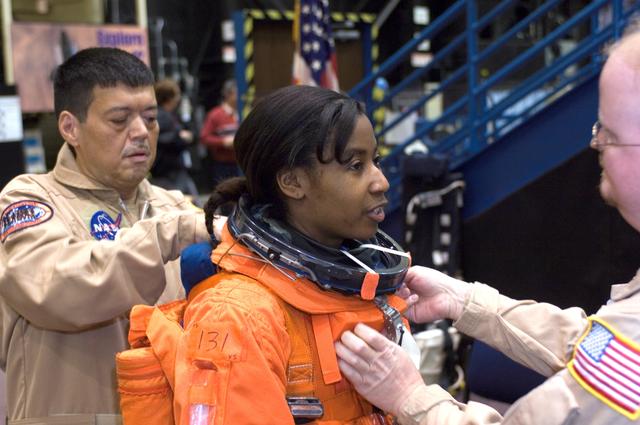 JSC2007-E-18069 (9 April 2007) --- Astronaut Stephanie D. Wilson, STS-120 mission specialist, dons a training version of her shuttle launch and entry suit, in preparation for a training session in the Space Vehicle Mockup Facility at the Johnson Space Center. United Space Alliance suit technicians Steve Cortinas (left) and Daniel Palmer (right, partially out of frame) assisted Wilson.