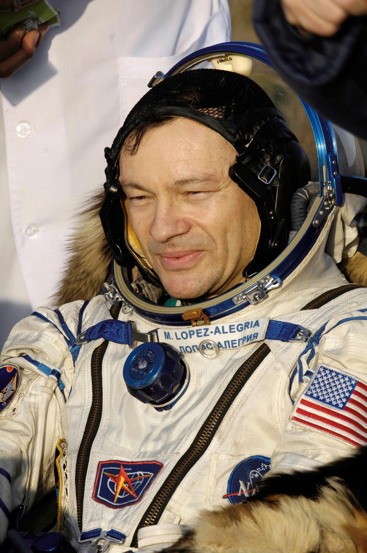 JSC2007-E-19321 (21 April 2007) --- Astronaut Michael E. Lopez-Alegria, Expedition 14 commander and NASA station science officer, sits in a chair near the Soyuz TMA-9 spacecraft at the landing site. Landing and recovery officials were conducting post-landing medical checks on the three crewmembers. The Soyuz spacecraft landed southwest of Karaganda, Kazakhstan at approximately 6:30 p.m. local time, April 21, 2007. Photo Credit: NASA/Bill Ingalls