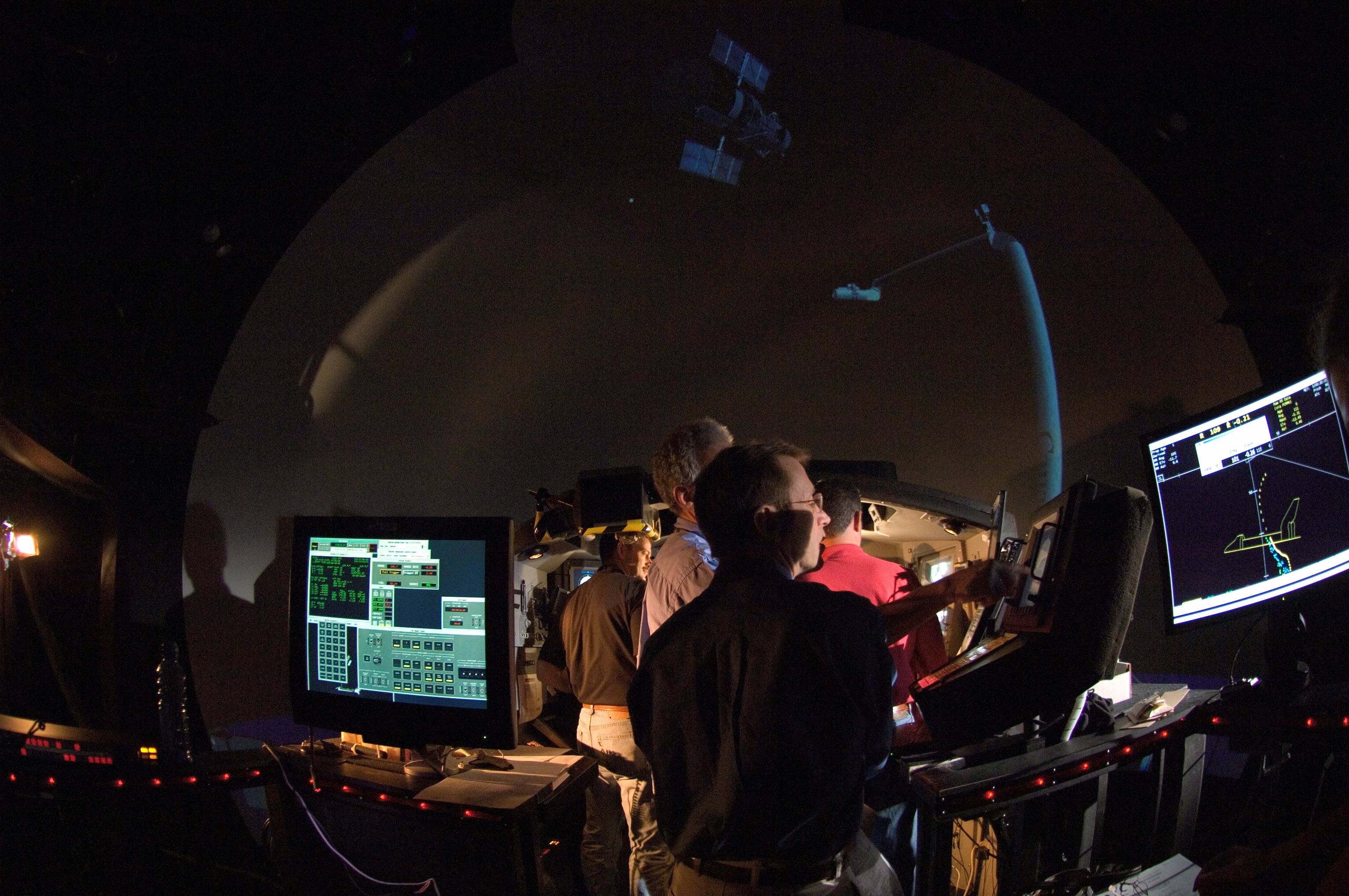 JSC2008-E-007759 (28 Jan. 2008) --- STS-125 crewmembers participate in an exercise in the systems engineering simulator in the Avionics Systems Laboratory at Johnson Space Center. The facility includes moving scenes of full-sized Hubble Space Telescope components over a simulated Earth. Pictured are astronauts Andrew J. Feustel (foreground), Michael T. Good, both mission specialists; and Scott D. Altman, commander.