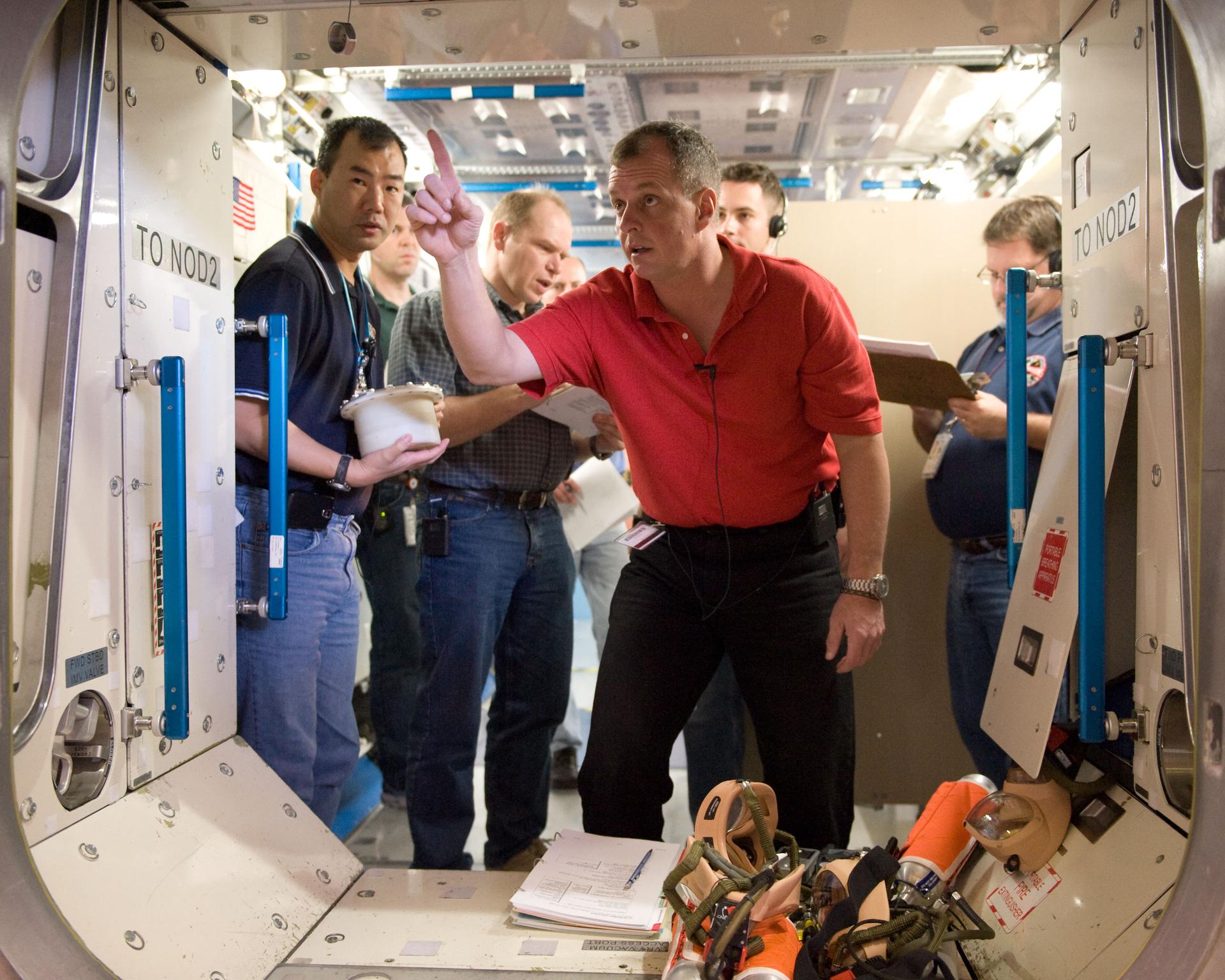 JSC2009-E-053504 (6 March 2009) --- NASA astronaut T.J. Creamer (foreground) and Japan Aerospace Exploration Agency (JAXA) astronaut Soichi Noguchi (left), both Expedition 22/23 flight engineers; along with cosmonaut Oleg Kotov (center background), Expedition 22 flight engineer and Expedition 23 commander, participate in an emergency procedure training session in an International Space Station mock-up/trainer in the Space Vehicle Mock-up Facility at NASA?s Johnson Space Center.