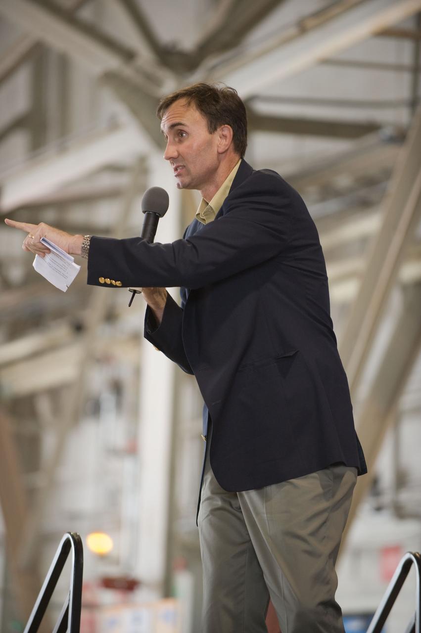 JSC2009-E-207802 (12 Sept. 2009) --- U.S. Rep. Pete Olson addresses a large crowd of well-wishers at the STS-128 crew return ceremony on Sept. 12, 2009 at Ellington Field near NASA's Johnson Space Center.