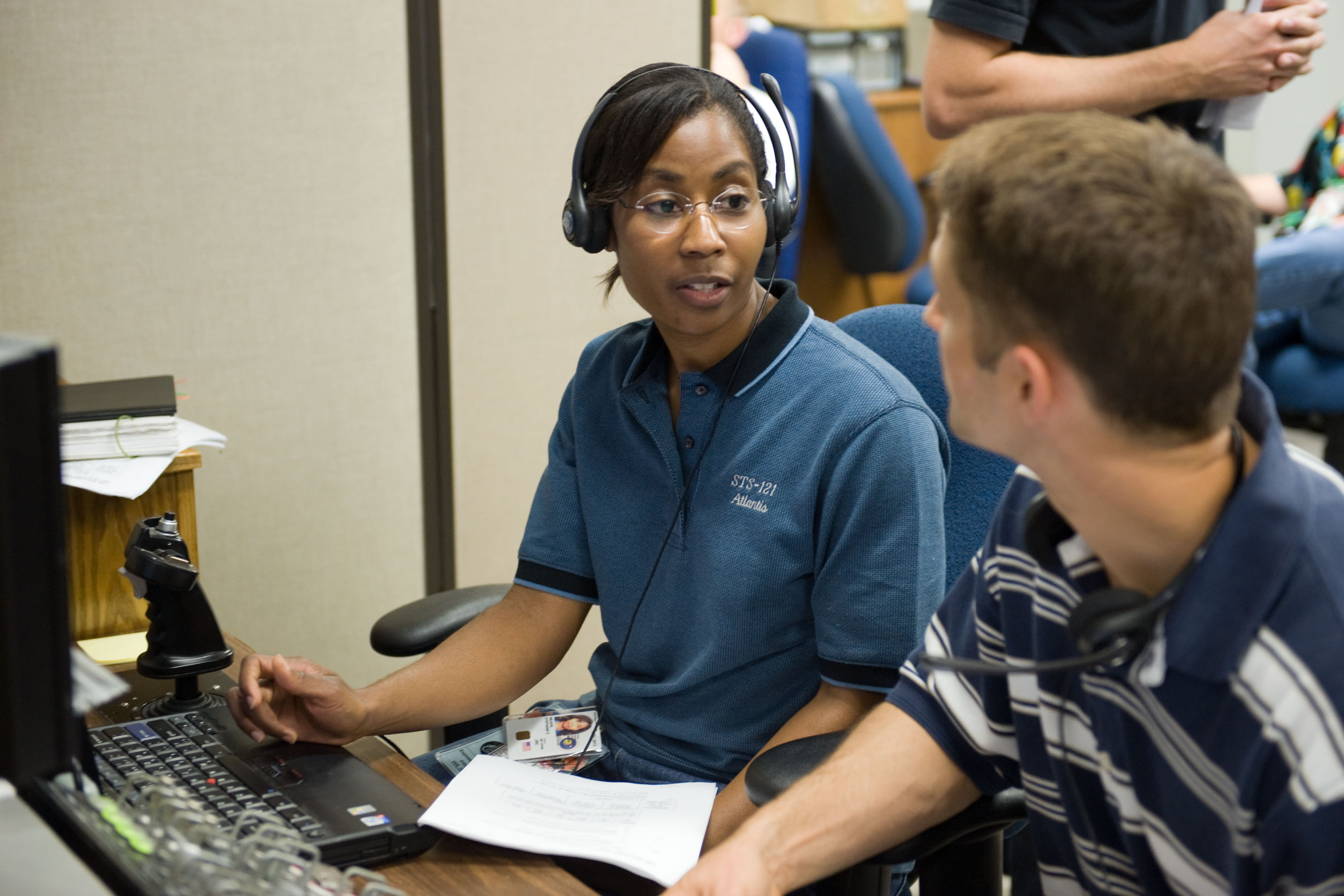JSC2009-E-214321 (25 Sept. 2009) --- NASA astronauts James P. Dutton Jr., STS-131 pilot; and Stephanie Wilson, mission specialist, use the virtual reality lab in the Space Vehicle Mock-up Facility at NASA's Johnson Space Center to train for some of their duties aboard the space shuttle and space station. This type of computer interface, paired with virtual reality training hardware and software, helps to prepare the entire team for dealing with space station elements.