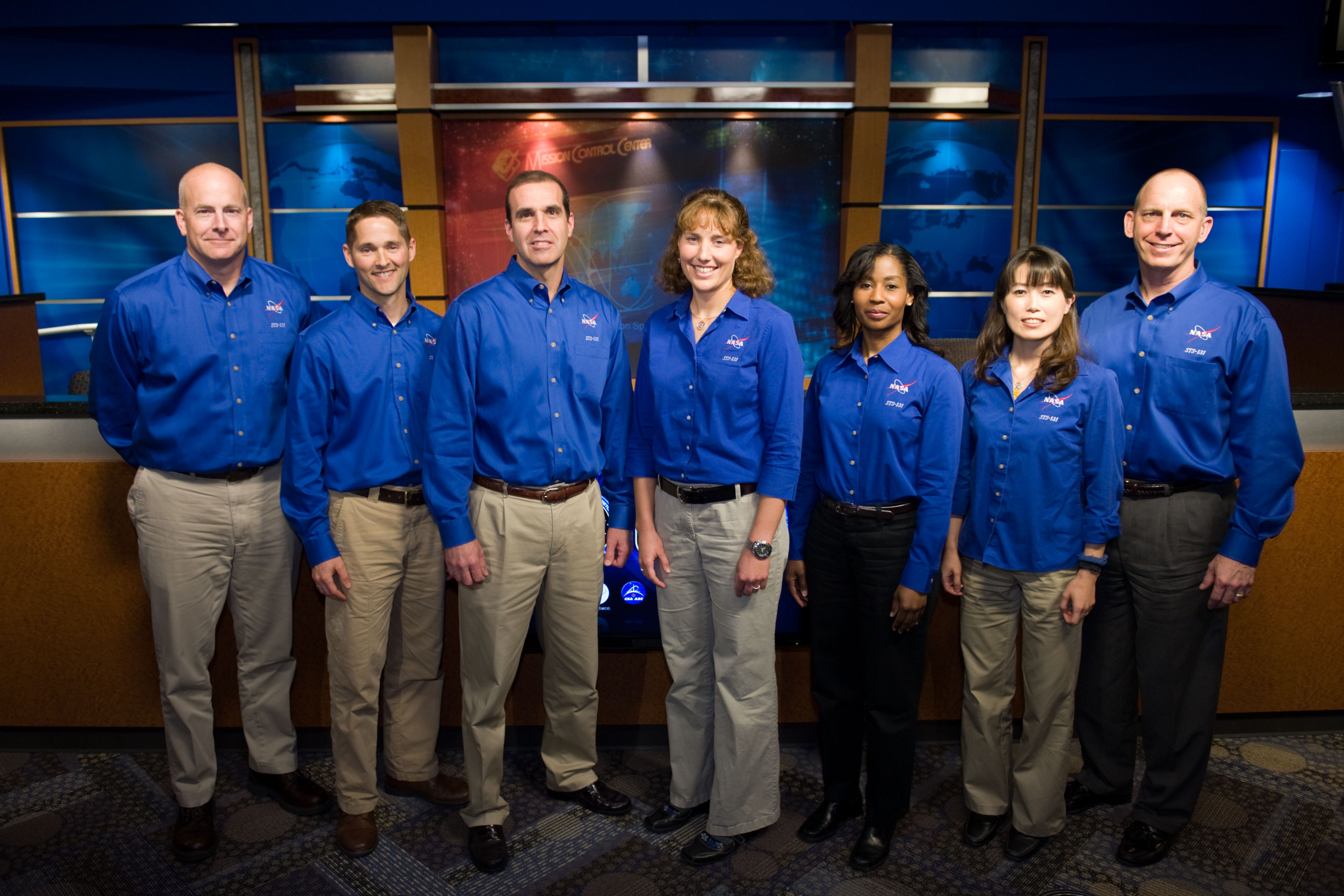 JSC2010-E-038821 (9 March 2010) --- NASA astronaut Alan Poindexter (far left) STS-131 mission commander, and his crew pose for photos during the press day event for the scheduled April mission. NASA astronauts Poindexter and James Dutton (second left) will serve as the commander and pilot, respectively. They will be joined by (from third left) astronauts Rick Mastracchio, Dorothy Metcalf-Lindenburger, Stephanie Wilson, along with Naoko Yamazaki of the Japan Aerospace Exploration Agency, and Clayton Anderson, all mission specialists.