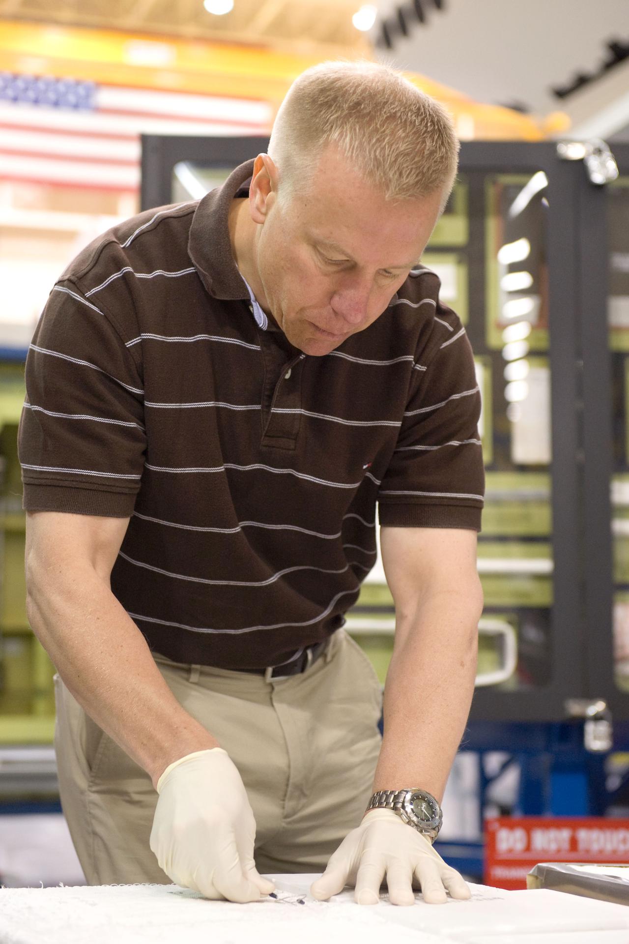 JSC2010-E-044337 (30 March 2010) --- NASA astronaut Tim Kopra, STS-133 mission specialist, participates in an EVA tile repair training session in the Space Vehicle Mockup Facility at NASA's Johnson Space Center.