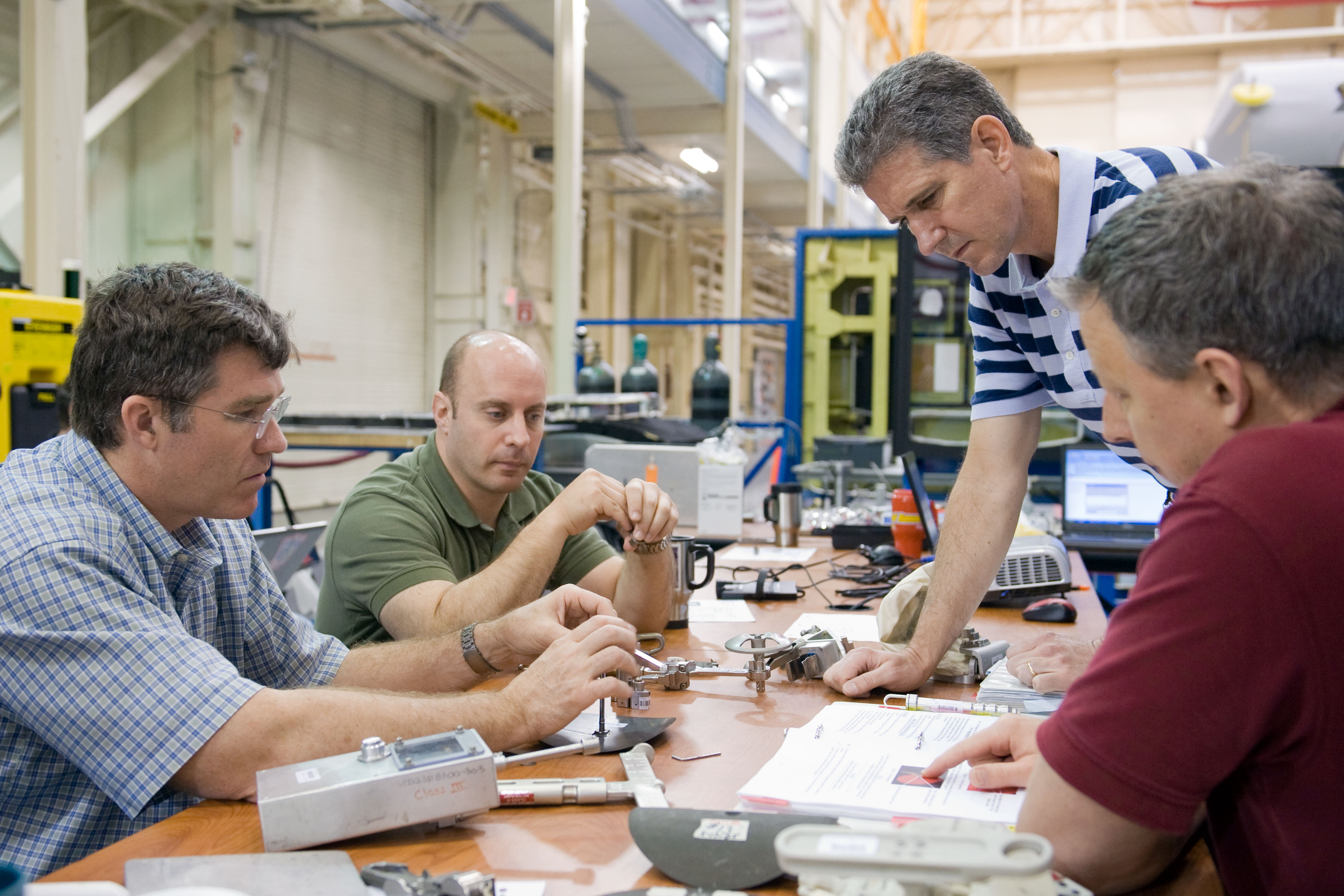 JSC2010-E-046478 (2 April 2010) --- NASA astronauts Steve Bowen (left), Garrett Reisman (second left) and Michael Good, all STS-132 mission specialists, participate in an EVA tile repair training session in the Space Vehicle Mockup Facility at NASA's Johnson Space Center. Instructor John Ray (right foreground) assisted the crew members.