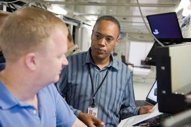 JSC2010-E-084029 (18 May 2010) --- NASA astronauts Eric Boe (foreground), STS-133 pilot; and Alvin Drew, mission specialist, participate in a robotics training session in the Jake Garn Simulation and Training Facility at NASA's Johnson Space Center.