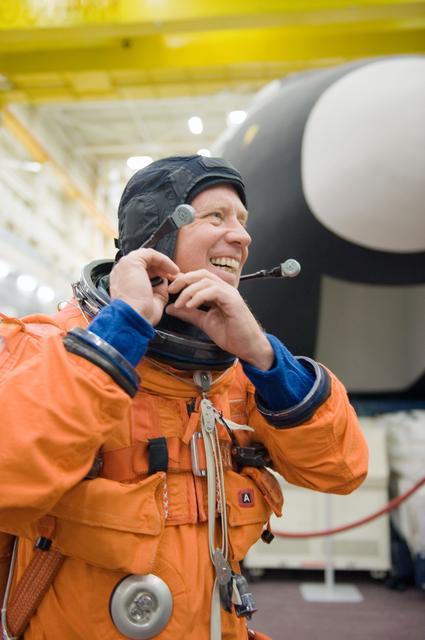 JSC2010-E-166824 (24 Sept. 2010) --- NASA astronaut Steve Lindsey, STS-133 commander, dons a training version of his shuttle launch and entry suit in preparation for a training session in the Space Vehicle Mock-up Facility at NASA's Johnson Space Center. Photo credit: NASA or National Aeronautics and Space Administration