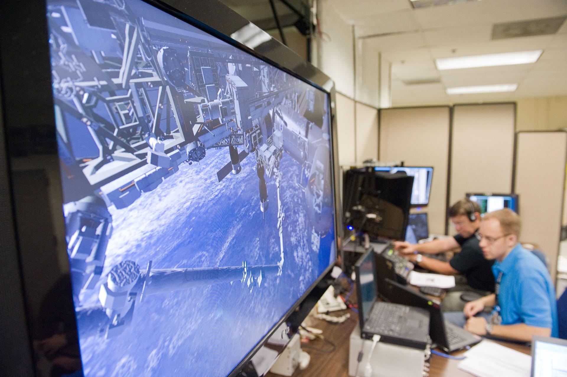 JSC2010-E-170877 (1 Oct. 2010) --- A large monitor is featured in this image during STS-133 crew members? training activities in the virtual reality laboratory in the Space Vehicle Mock-up Facility at NASA's Johnson Space Center. Photo credit: NASA or National Aeronautics and Space Administration