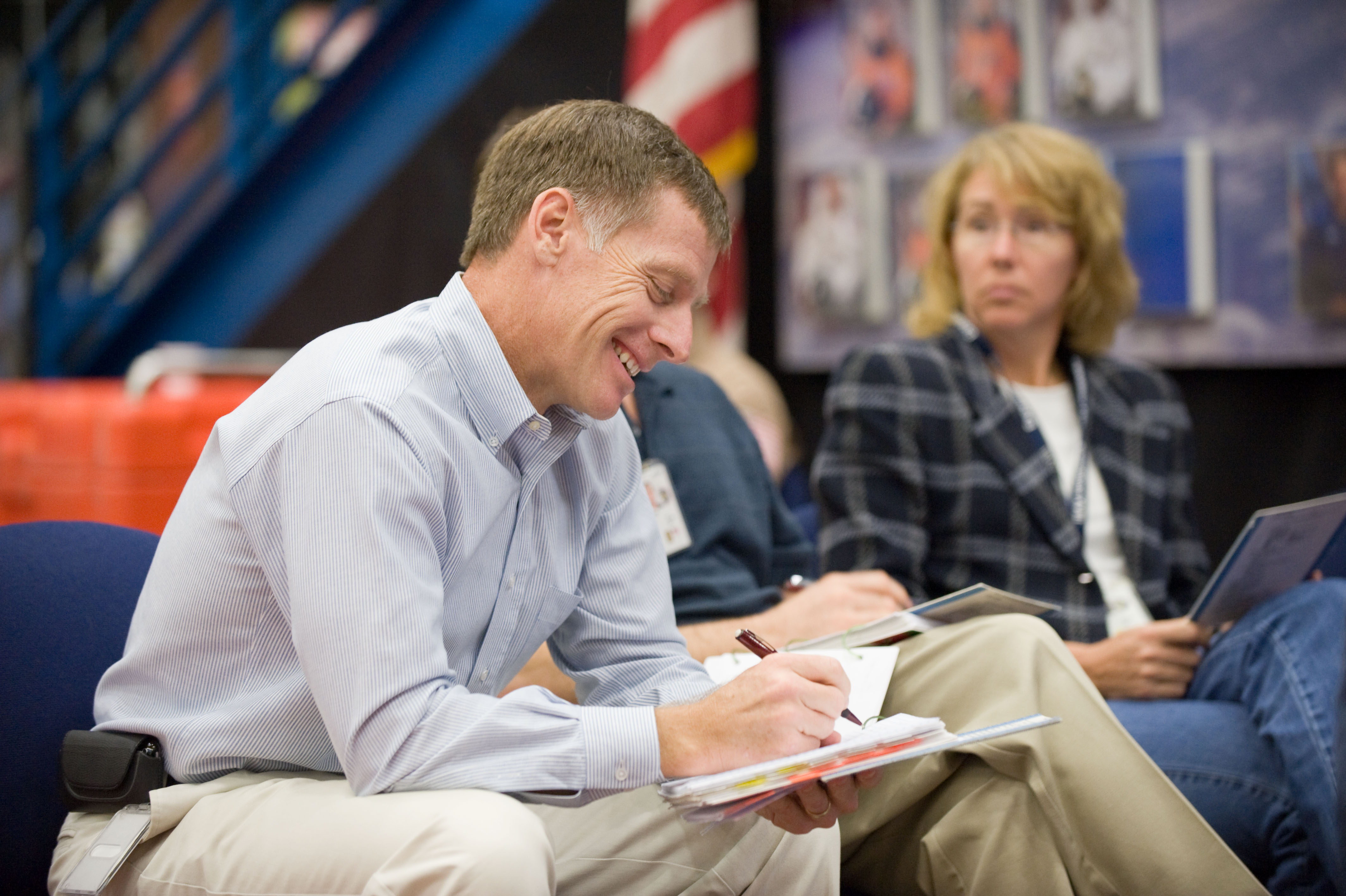 JSC2010-E-195517 (3 Dec. 2010) --- NASA astronauts Chris Ferguson, STS-135 commander; Rex Walheim (mostly obscured) and Sandy Magnus, both mission specialists, are pictured during an emergency egress training session in the Space Vehicle Mock-up Facility at NASA's Johnson Space Center. STS-135 is planned to be the final mission of the space shuttle program. Photo credit: NASA or National Aeronautics and Space Administration