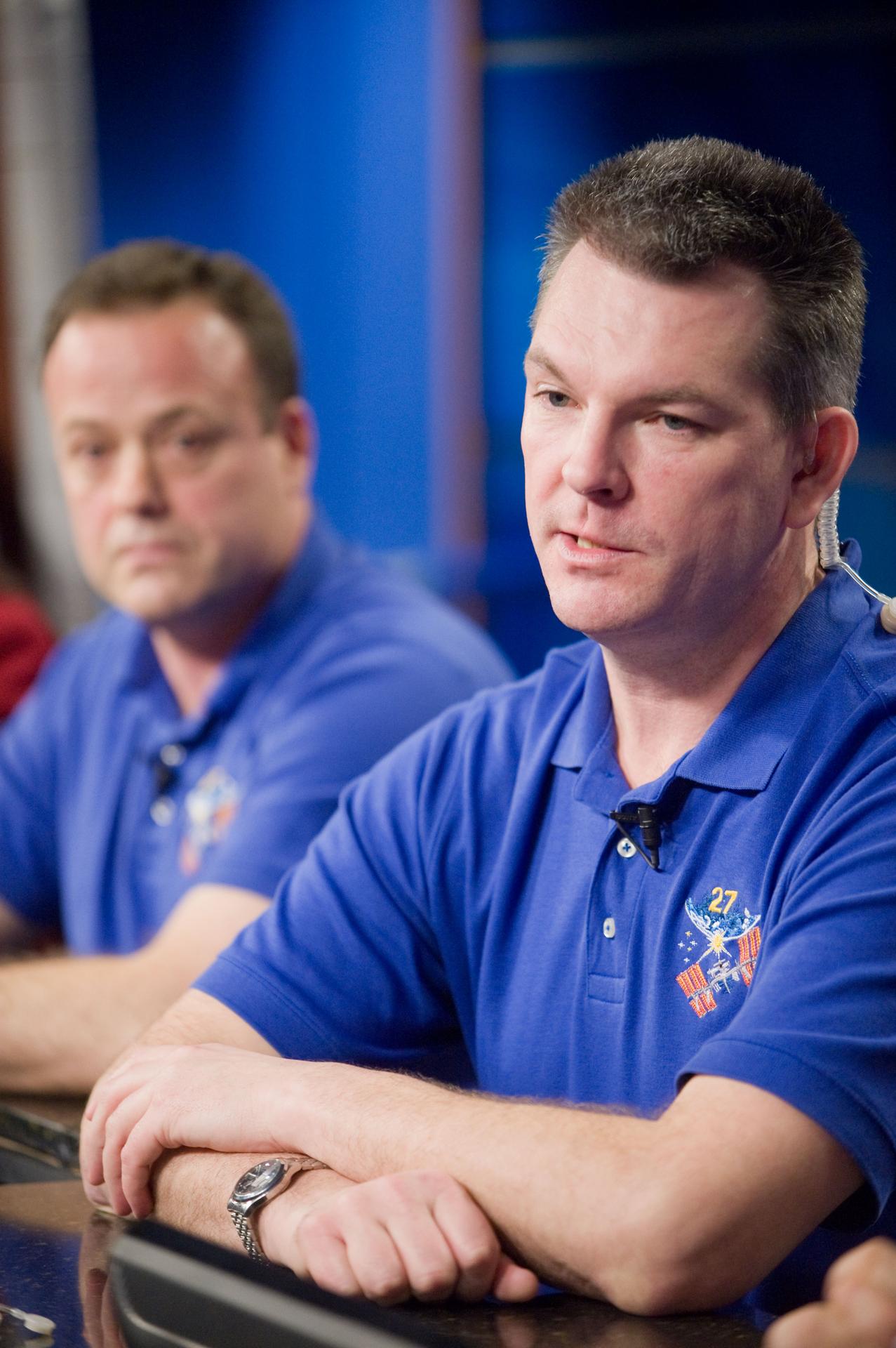 PHOTO DATE: 01-26-11 LOCATION: Bldg 2 SUBJECT: Expedition 27 press conference with NASA astronaut Ron Garan and his crewmates, Russian cosmonauts Aleksandr Samokutyayev and Andrei Borisenko PHOTOGRAPHER: James Blair