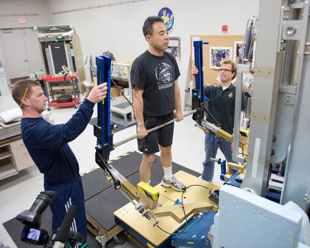 PHOTO DATE: 02-03-11 LOCATION: Bldg 26, 104 SUBJECT: Photograph JAXA astronaut and Expedition 28 crew member Satoshi Furukawa during ARED PT training. Instructors are Robert Tweedy (glasses) and BruceNieschwitz PHOTOGRAPHER: James Blair