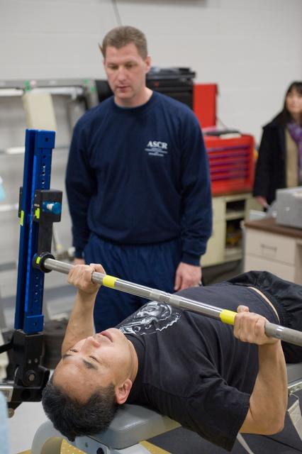 PHOTO DATE: 02-03-11 LOCATION: Bldg 26, 104 SUBJECT: Photograph JAXA astronaut and Expedition 28 crew member Satoshi Furukawa during ARED PT training. Instructors are Robert Tweedy (glasses) and BruceNieschwitz PHOTOGRAPHER: James Blair