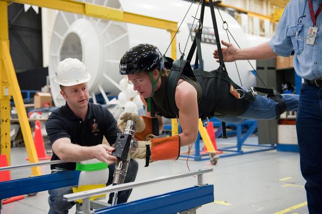 JSC2011-E-017403 (16 Feb. 2011) --- NASA astronaut Sandy Magnus, STS-135 mission specialist, participates in an extravehicular activity (EVA) training session in the Partial Gravity Simulator (POGO) test area in the Space Vehicle Mock-up Facility at NASA's Johnson Space Center. Photo credit: NASA or National Aeronautics and Space Administration