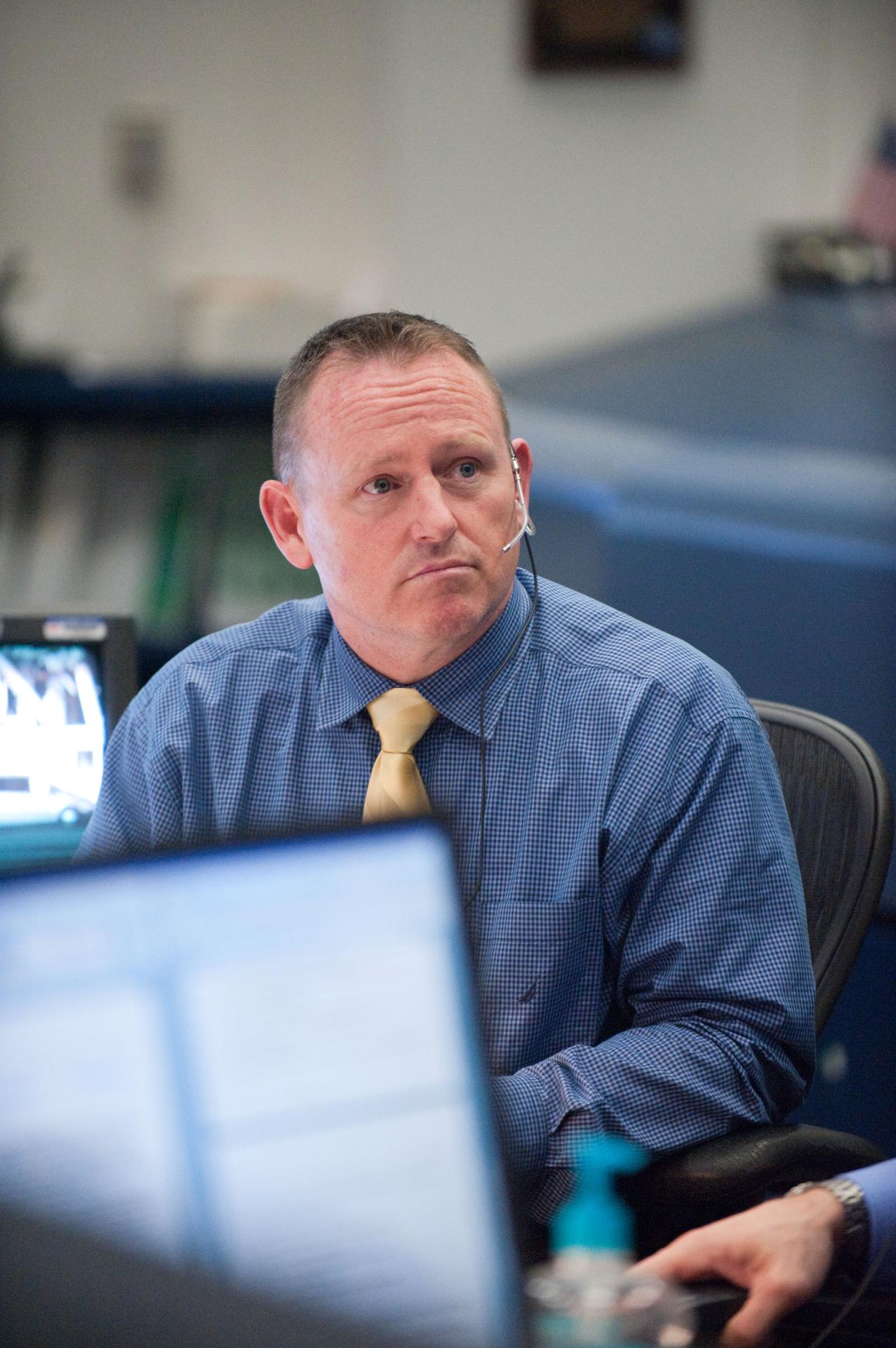 STS-133 flight controllers on console during the launch of Discovery with Flight Director Richard Jones. Photo Date: February 24, 2011. Location: Building 30 south - WFCR. Photographer: Robert Markowitz.