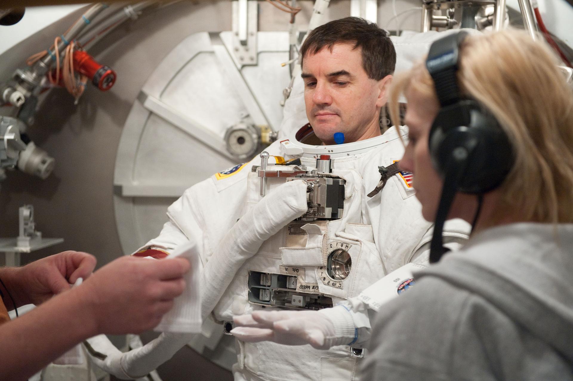 JSC2011-E-026868 (11 March 2011) --- NASA astronaut Rex Walheim, STS-135 mission specialist, participates in an Extravehicular Mobility Unit (EMU) spacesuit fit check in the Space Station Airlock Test Article (SSATA) in the Crew Systems Laboratory at NASA's Johnson Space Center. Photo credit: NASA or National Aeronautics and Space Administration