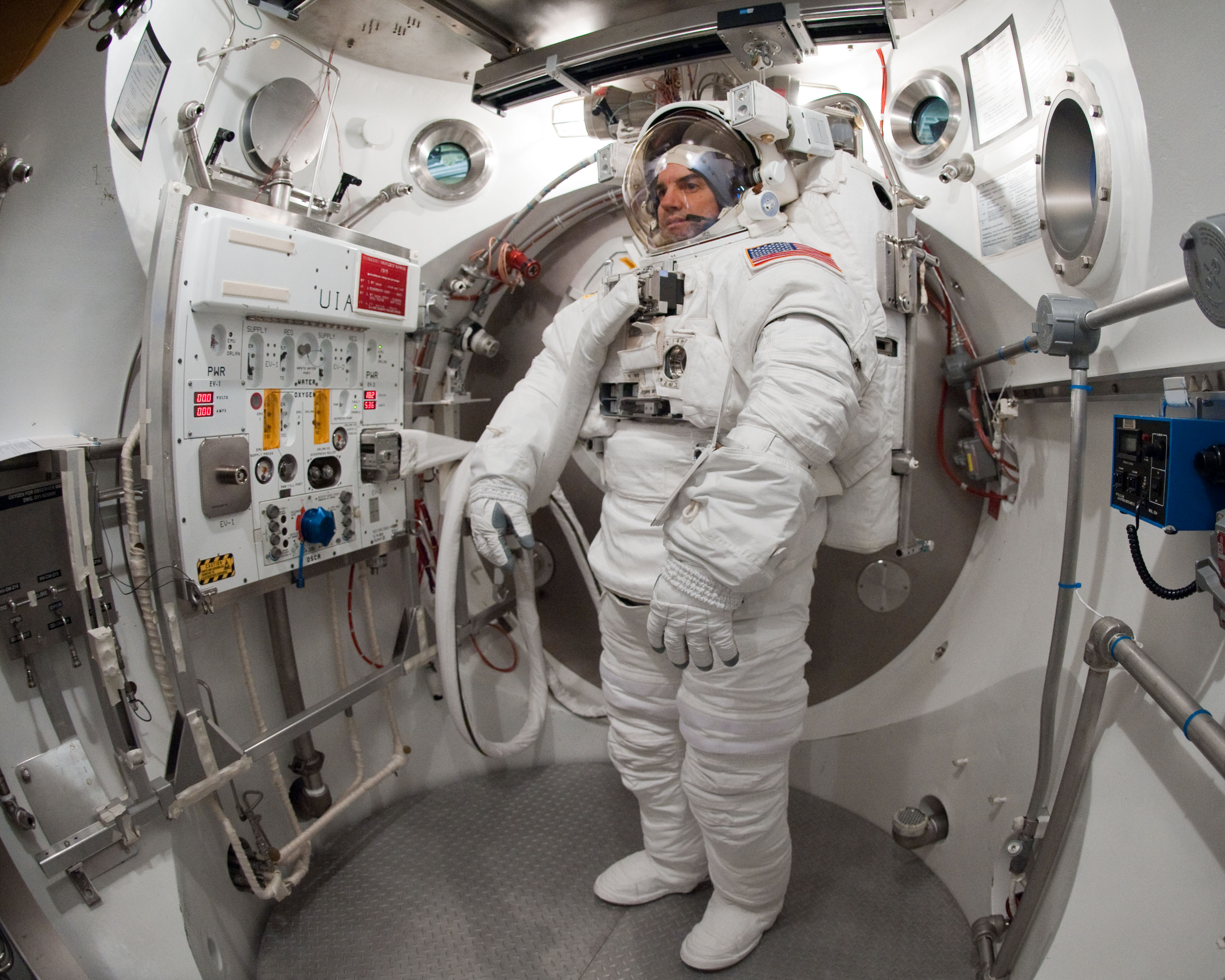 JSC2011-E-026880 (11 March 2011) --- NASA astronaut Rex Walheim, STS-135 mission specialist, participates in an Extravehicular Mobility Unit (EMU) spacesuit fit check in the Space Station Airlock Test Article (SSATA) in the Crew Systems Laboratory at NASA's Johnson Space Center. Photo credit: NASA or National Aeronautics and Space Administration