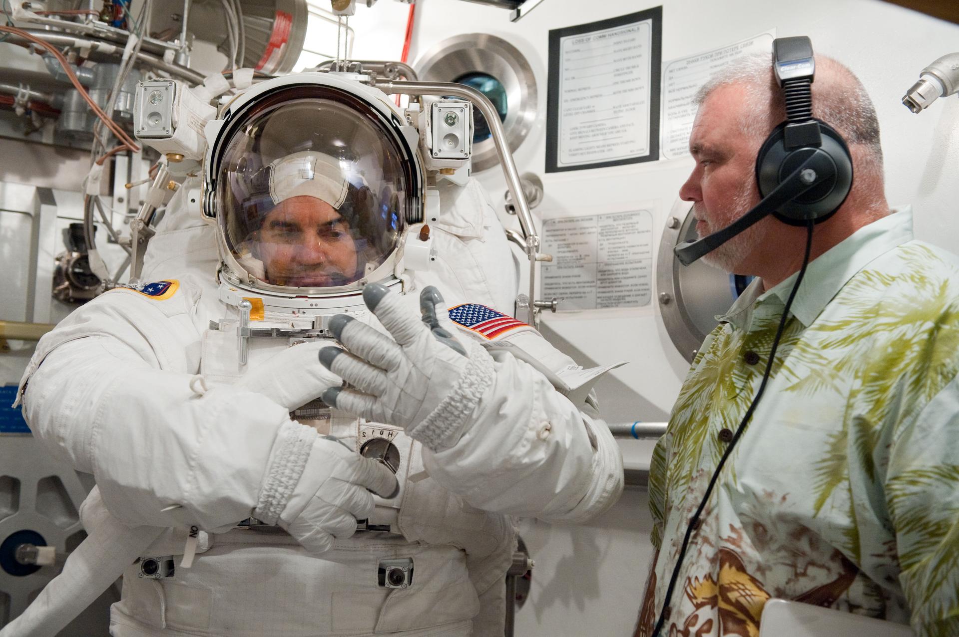 JSC2011-E-026887 (11 March 2011) --- NASA astronaut Rex Walheim, STS-135 mission specialist, participates in an Extravehicular Mobility Unit (EMU) spacesuit fit check in the Space Station Airlock Test Article (SSATA) in the Crew Systems Laboratory at NASA's Johnson Space Center. Photo credit: NASA or National Aeronautics and Space Administration