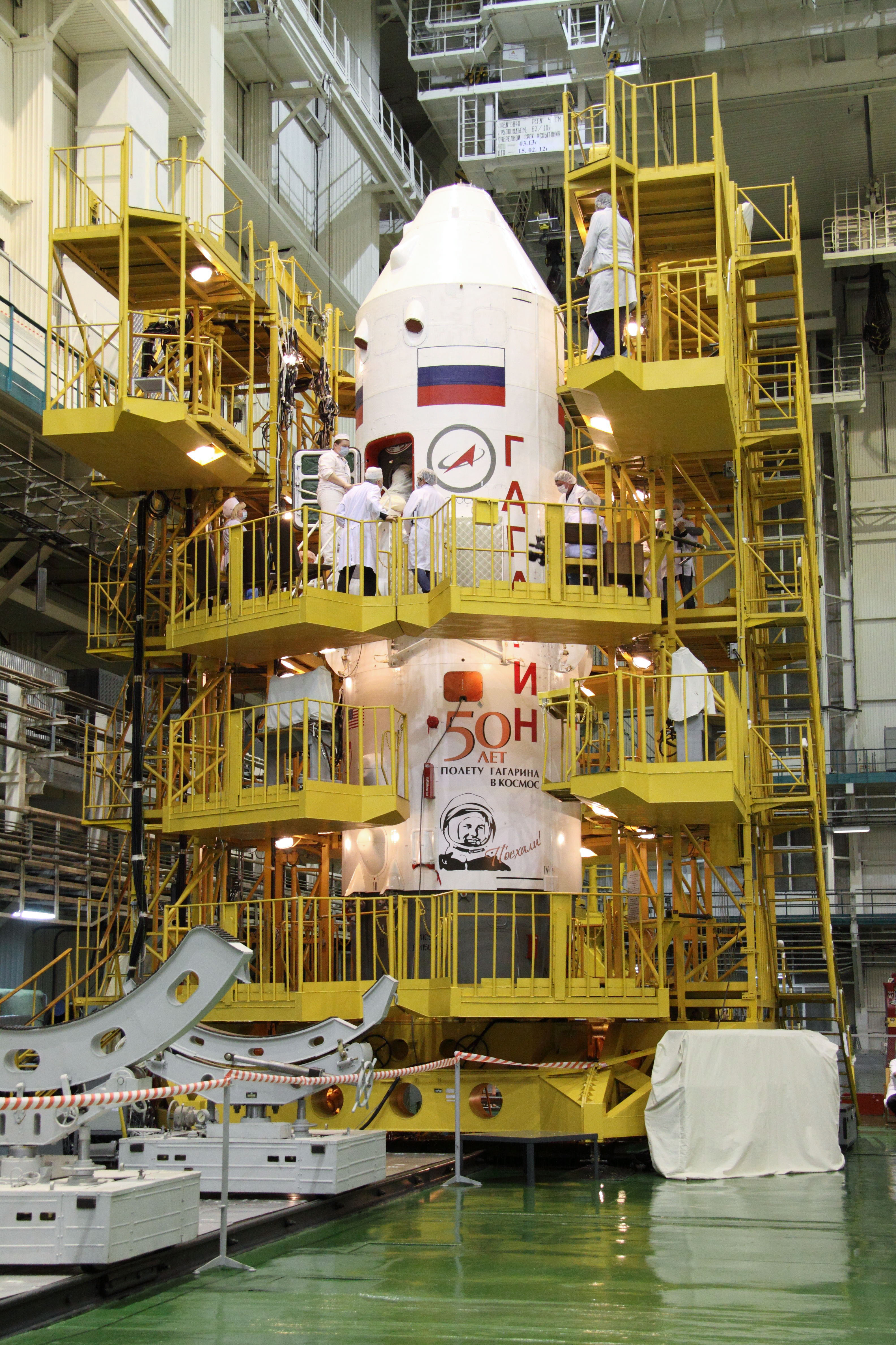 (31 March 2011) --- Technicians at the Baikonur Cosmodrome in Kazakhstan pore over the Soyuz TMA-21 spacecraft encapsulated in the first stage of the Soyuz booster rocket March 31, 2011 as preparations continue for the launch April 5 (Kazakhstan time) of Expedition 27 crew members -- Ron Garan of NASA, Soyuz commander Alexander Samokutyaev and Andrey Borisenko, both of Russia, to the International Space Station. The first stage of the Soyuz booster is emblazoned with the name “Gagarin” and the likeness of Yuri Gagarin. The launch is dedicated to the 50th anniversary of the launching of Gagarin from Baikonur April 12, 1961 to become the first human to fly in space. Photo credit: NASA/Victor Zelentsov