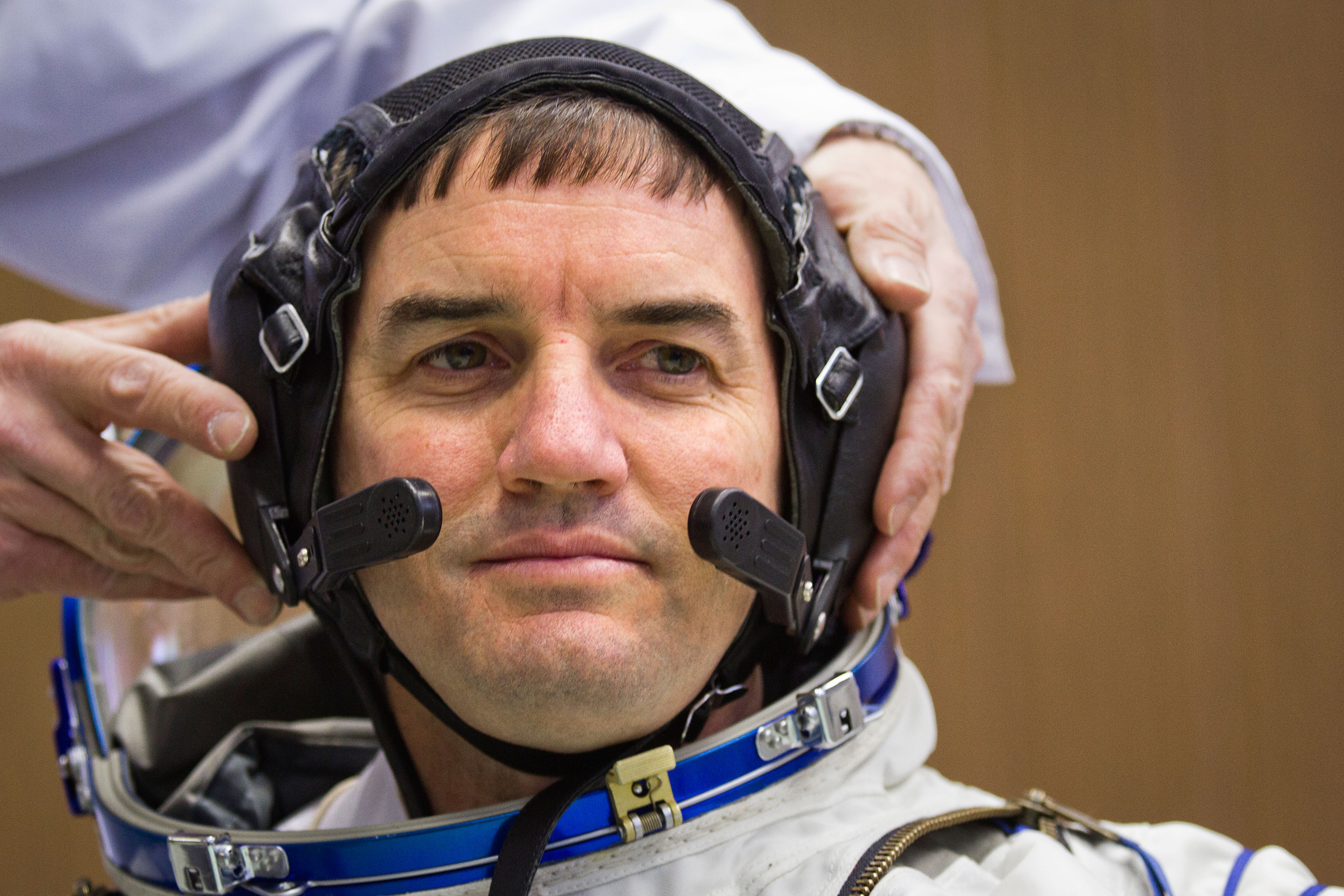 JSC2011-E-040298 (28 March 2011) --- NASA astronaut Rex Walheim, STS-135 mission specialist, undergoes a fit check of his Sokol spacesuit at the Zvezda facility in Moscow on March 28, 2011. The crew of the final shuttle mission traveled to Moscow for a suit fit check of their Russian suits would be required in the event of an emergency. Photo credit: NASA Photo/Houston Chronicle, Smiley N. Pool