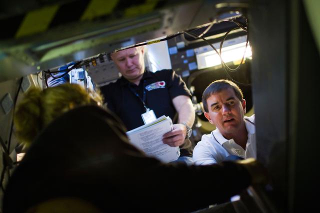 JSC2011-E-040335 (4 April 2011) --- NASA astronauts Rex Walheim, right, Sandy Magnus, foreground, both mission specialists, and Doug Hurley, pilot, work on the flight deck as the crew of STS-135 trains in the Fixed Base Simulator at NASA?s Johnson Space Center in Houston April 4, 2011. Photo credit: NASA Photo/Houston Chronicle, Smiley N. Pool