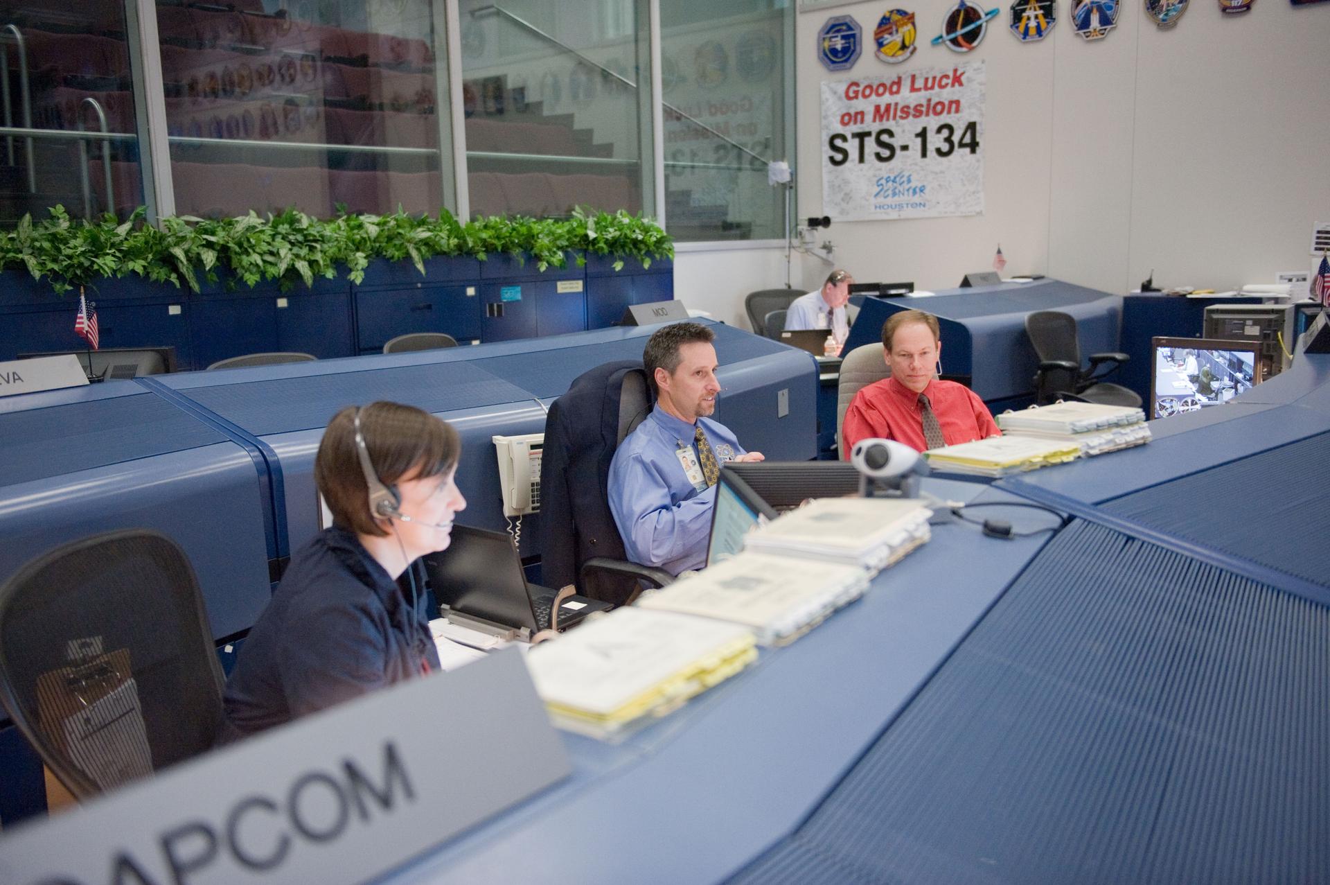 JSC2011-E-046798 (19 May 2011) --- NASA astronaut Megan McArthur, spacecraft communicator (CAPCOM); flight director Gary Horlacher (center) and John McCullough, chief of the Flight Director Office, are pictured in the space shuttle flight control room in the Mission Control Center at NASA's Johnson Space Center during STS-134 flight day four activities. Photo credit: NASA