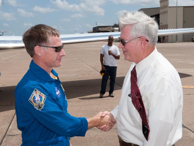 JSC2011-E-070263 (22 July 2011) --- NASA's Johnson Space Center (JSC) director Michael L. Coats (right) greets NASA astronaut Chris Ferguson, STS-135 commander, shortly after he and three other crew members arrived at Ellington Field near JSC. Awaiting them was a large crowd on hand in nearby Hangar 990 to welcome them home to Houston during a return ceremony for the final mission for the Space Shuttle Program. Photo credit: NASA
