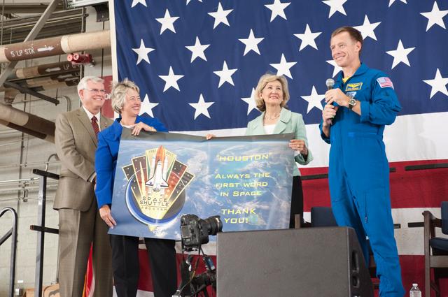 JSC2011-E-070471 (22 July 2011) --- NASA's Johnson Space Center (JSC) director Michael L. Coats (left), Houston Mayor Annise Parker, U.S. Senator Kay Bailey Hutchison (R.-Texas) and NASA astronaut Chris Ferguson, STS-135 commander, are pictured during the STS-135 crew return ceremony on July 22, 2011 at Ellington Field near JSC. Photo credit: NASA