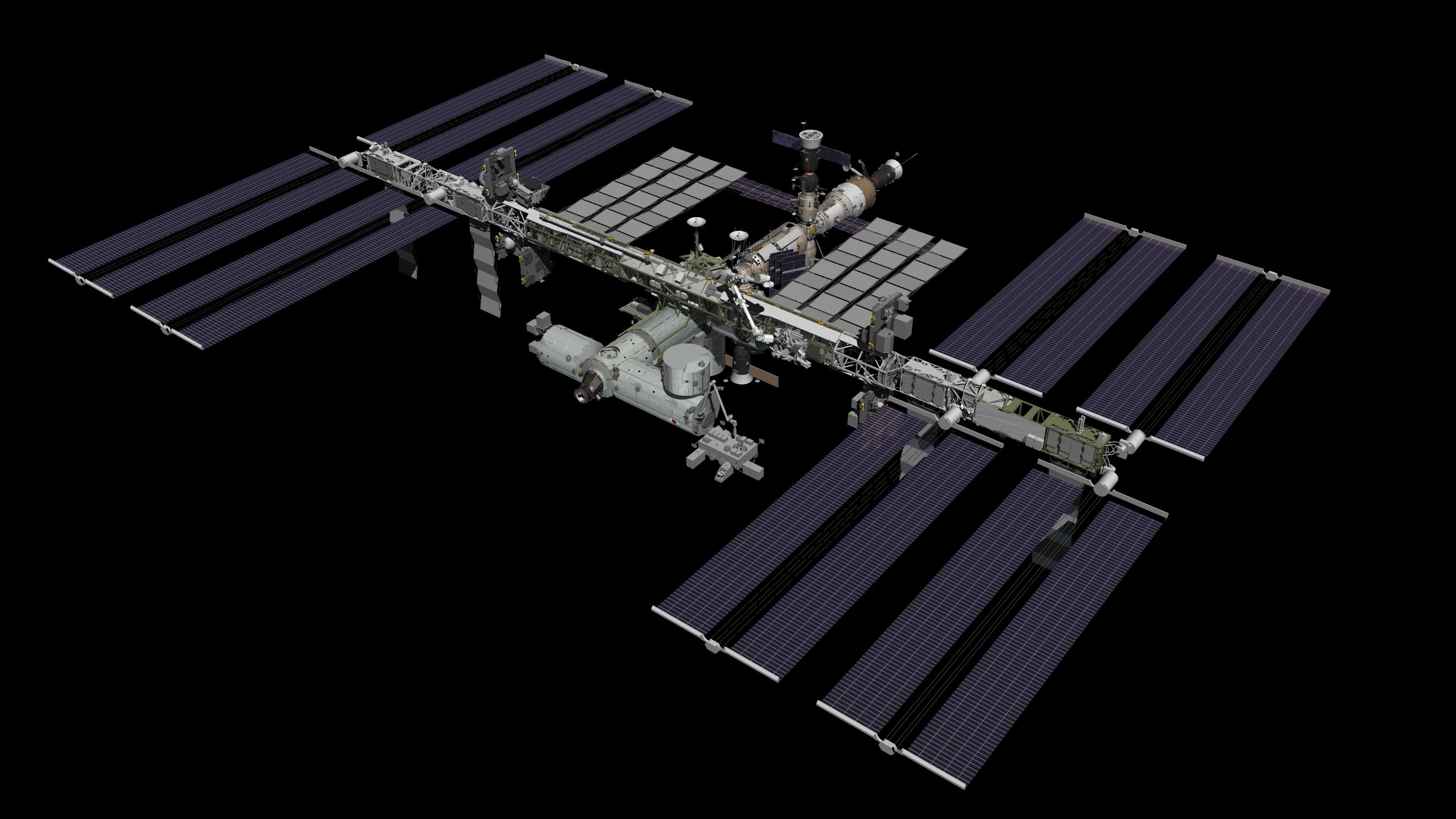 JSC2011-E-072138 (July 2011) --- Computer-generated artist?s rendering of the port view of the complete configuration of the International Space Station as of July 18, 2011, following the STS-135 mission. Progress 43 is linked to the aft port of the Zvezda Service Module. Soyuz 27 (TMA-02M) is docked to the Rassvet Mini-Research Module 1 (MRM1). Progress 42 is attached to the Pirs Docking Compartment and Soyuz 26 (TMA-21) is docked to the Poisk Mini-Research Module 2 (MRM2). Photo credit: NASA