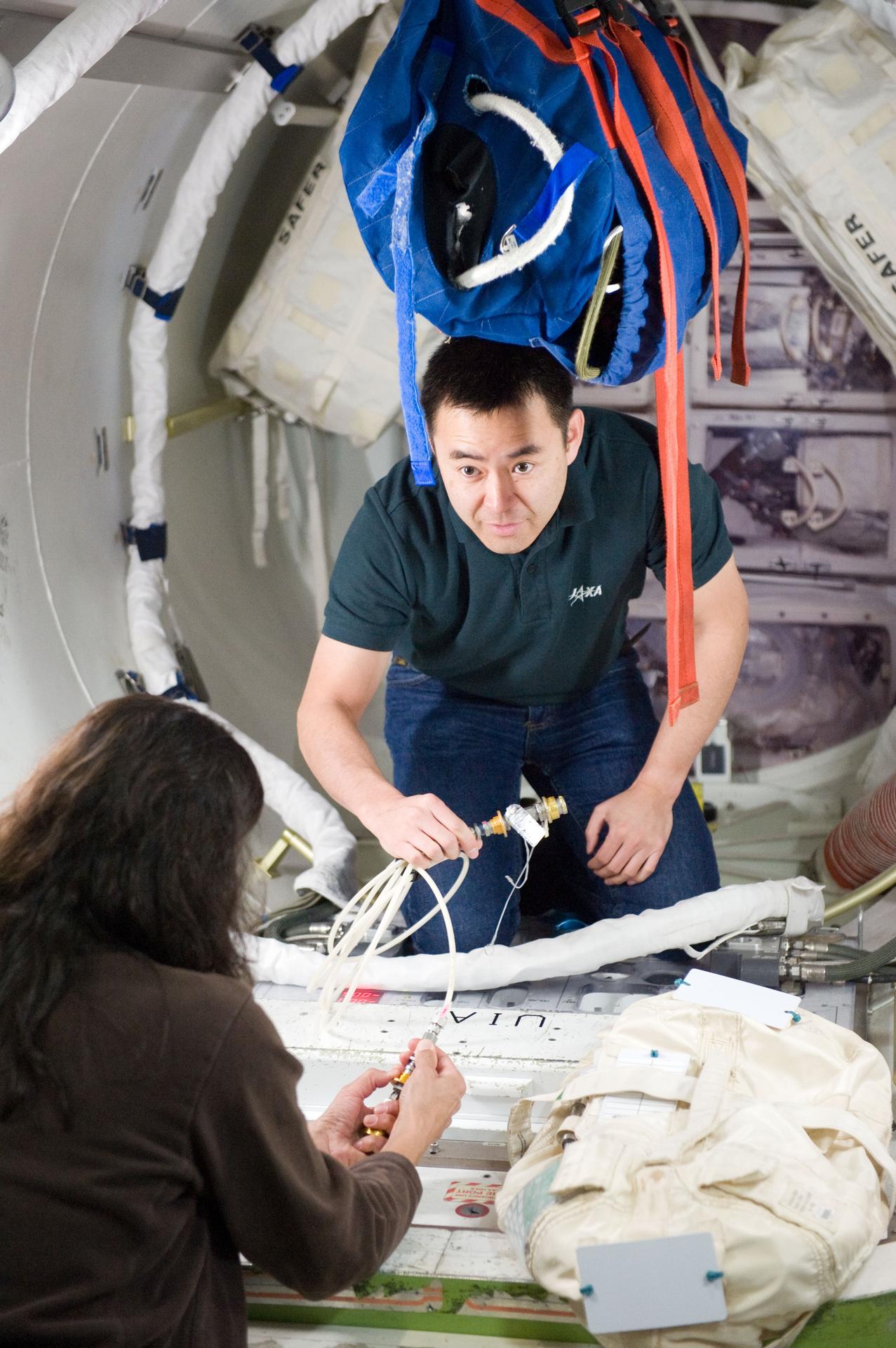 Date: 03-13-12 Location: Bldg 9NW, ISS Airlock Subject: Expedition 32 (Soyuz 31) crew members Aki Hoshide, Sunita Williams and Joe Acaba during ISS EVA planning and preparation Photographer: James Blair